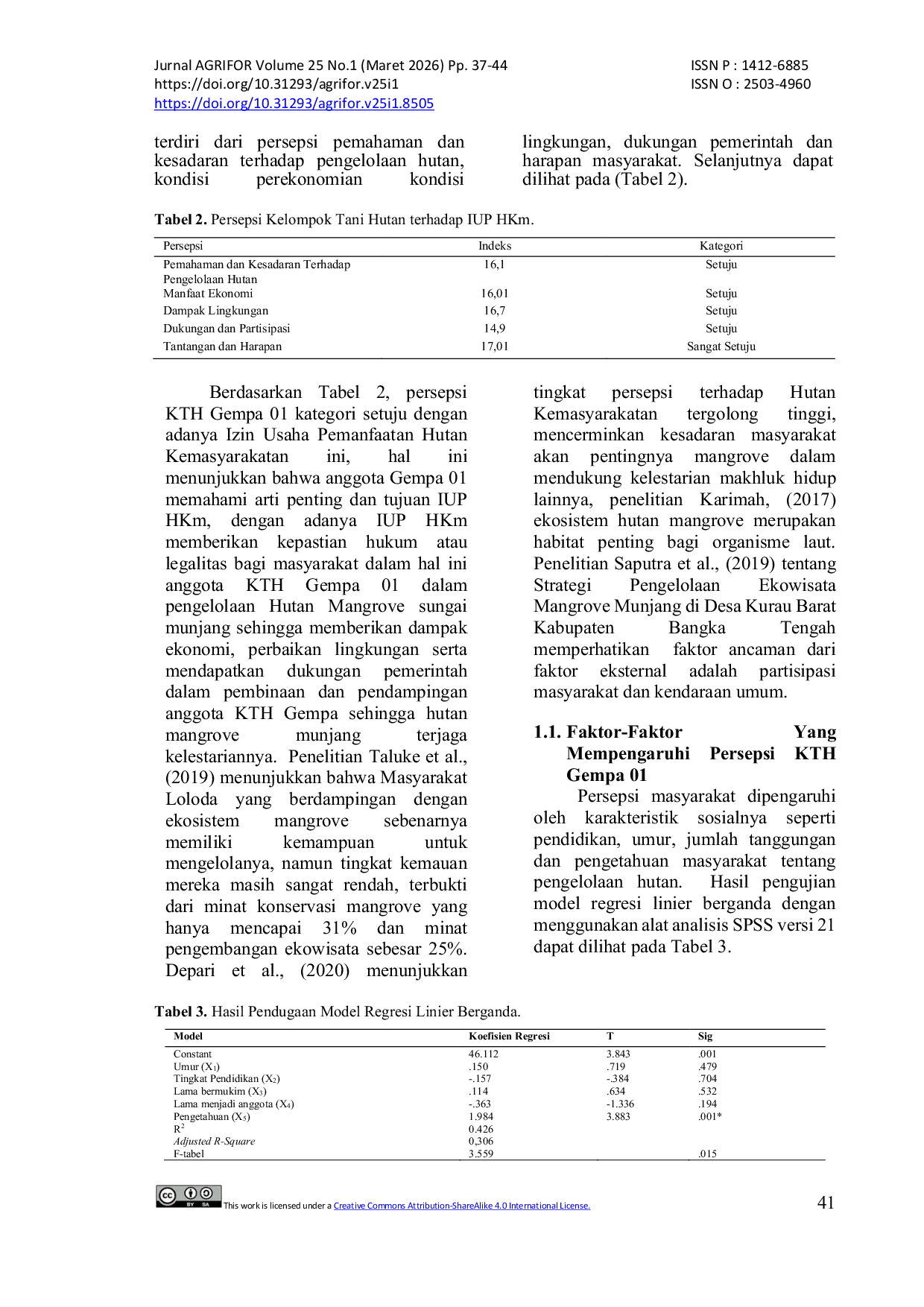 Agrifor : Jurnal Ilmu Pertanian dan KehutananAgrifor : Jurnal Ilmu Pertanian dan KehutananAspek terpenting dalam pembangunan sektor kehutanan adalah memberikan kesempatan kepada masyarakat untuk berperan serta dalam proses perhutanan sosial, khususnya di wilayah hutan dalam program HKm, yang memungkinkan masyarakat untuk secara langsung terlibat dalam pengelolaan hutan. Namun, keberhasilan program IUP-HKM sangat bergantung pada persepsi dan partisipasi masyarakat setempat. Penelitian ini bertujuan untuk menganalisis persepsi dan faktor yang mempengaruhi anggota Kelompok Tani Hutan (KTH) Gempa 01 terhadap implementasi Izin Usaha Pemanfaatan Hutan Kemasyarakatan (IUP-HKM) di Hutan Mangrove Sungai Munjang Desa Kurau Barat, Bangka Tengah. Metode yang digunakan adalah survei dengan pendekatan kuantitatif, menggunakan kuesioner yang diolah dengan skala Likert dan analisis regresi linier berganda. Hasil penelitian menunjukkan bahwa persepsi anggota KTH terhadap IUP-HKM secara umum setuju, bahwa terdapat adanya pemahaman dan kesadaran terhadap pengelolaan hutan, terdapat manfaat ekonomi yang dirasakan, menjaga kelestarian hutan mangrove, dukungan dan partisipasi masyarakat serta tantangan dalam pengelolan hutan mangrove. Faktor yang mempengaruhi persepsi secara simultan meliputi tingkat pendidikan, lama bermukim, dan tingkat pengetahuan tentang ekosistem mangrove, dan secara parsial variabel pengetahuan berpengaruh signifikan terhadap persepsi anggota KTH.