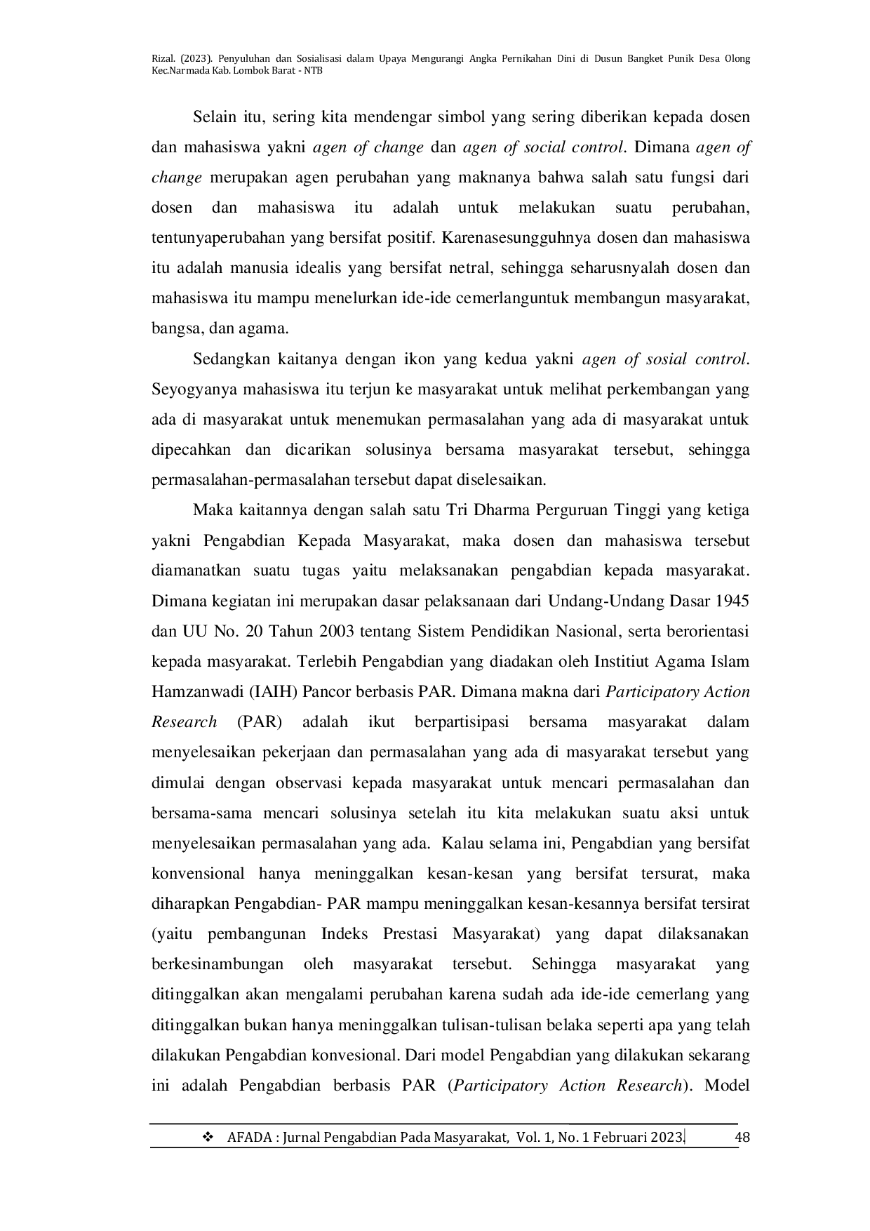 AFADA: Jurnal Pengabdian Pada MasyarakatAFADA: Jurnal Pengabdian Pada MasyarakatBeranjak dari kesejahteraan dan kelayakan hidup ini, dari jumlah penduduk yang kurang sejahtera dan menikmati hidup layak di Indonesia jumlah terbesar berada di daerah pedesaan. Dari segi terpenuhinya sarana dan prasarana, masyarakat yang hidup di daerah pedesaan jauh tertinggal dari masyarakat yang hidup di kota. Masyarakat kota lebih mudah mengakses segala sesuatu untuk memenuhi kebutuhan hidupnya. Selain itu, dilihat dari sosialisasi dan pendidikan yang tidak merata merupakan salah satu faktor pembuat masyarakat desa kurang memahami betapa pentingnya pendidikan, sehingga banyak masyarakat memiliki kondisi ekonomi rendah, karena kurangnya skill dan pengetahuan untuk menunjang kreativitas. Penduduk desa bermata pencarian sebagai petani, peternak, perkebunan, dan usaha-usaha lain yang hasilnya tidak bisa dipastikan. Jadi masyarakat di desa lebih memilih bekerja keras untuk memenuhi kebutuhannya daripada belajar di bangku sekolah. Anak-anak juga kurang mendapatkan perhatian dari orang tua sehingga mereka hidup dengan cara mereka sendiri. Dari beberapa program yang telah dilaksanakan tersebut, Tim Pengabdian-PAR melakukan evaluasi terkait dengan perubahan prilaku masyarakat. Secara umum masyarakat Dusun Bangket Punik Desa Golong mengalami perubahan perilaku berpikir dan bertindak dalam menyikapi berbagai problematika kehidupan. Hal ini ditandai dengan kesadaran masyarakat dalam memandang akan pentingnya pendidikan, kebersihan lingkungan, kreatifitas dan dalam hal kekompakan pada kegiatan gotong royong. Meskipun segala program yang telah dilaksanakan belum semuanya maksimal dalam pelaksananaanya, akan tetapi setidaknya ada suatu gebrakan untuk meyakinkan diri masyarakat untuk bisa memaksimalkan potensi yang ada pada diri mereka untuk hidup yang lebih baik lagi ke depannya.