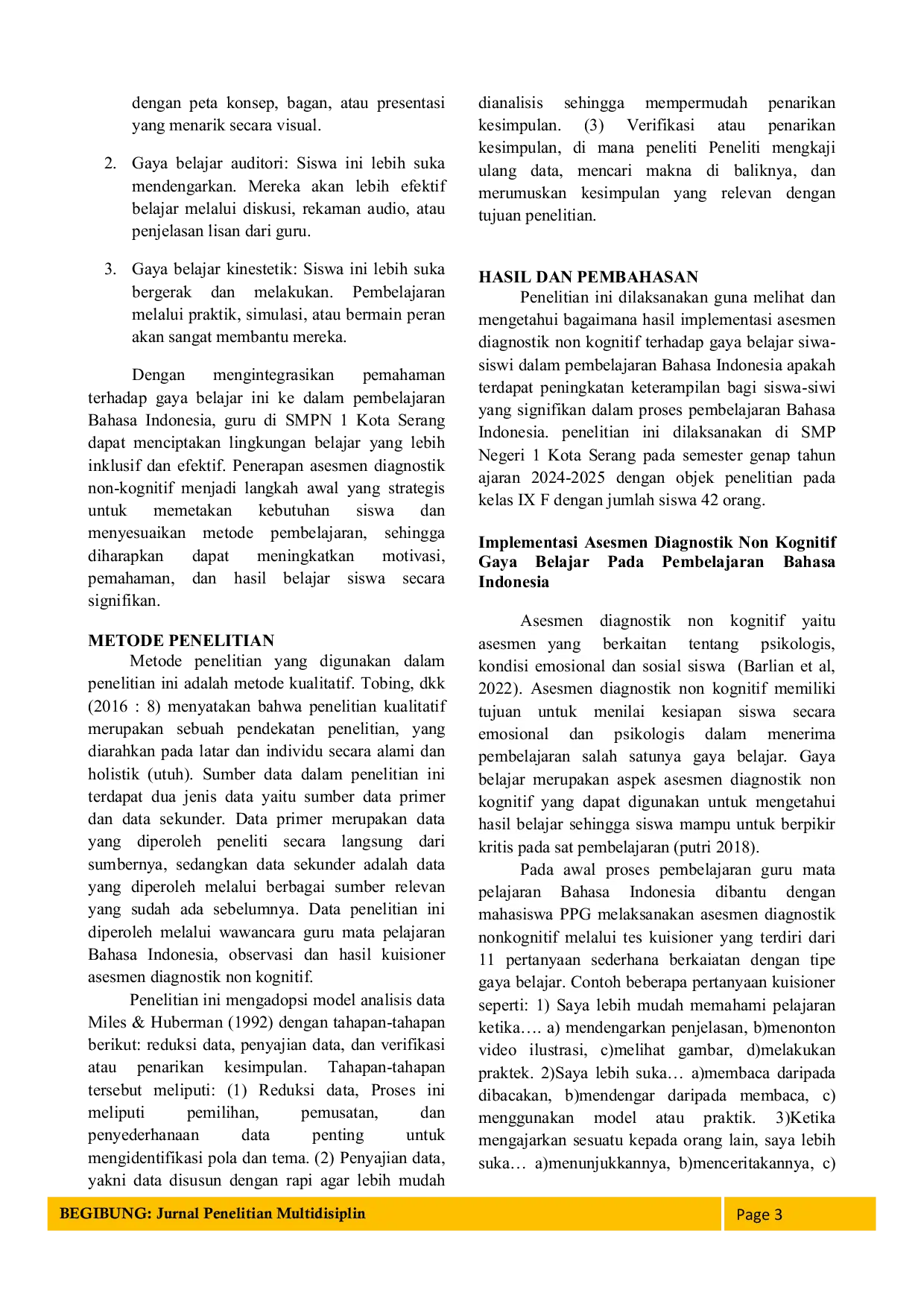 BEGIBUNG: Jurnal Penelitian MultidisiplinBEGIBUNG: Jurnal Penelitian MultidisiplinPenelitian ini mengkaji permasalahan pembelajaran Bahasa Indonesia di tingkat SMP yang sering kali terkendala oleh rendahnya minat, motivasi, dan keterampilan berbahasa peserta didik. Salah satu penyebabnya adalah pendekatan pembelajaran yang masih berpusat pada guru (teacher-centered), yang gagal mengakomodasi keragaman karakteristik siswa. Untuk mengatasi hal ini, penelitian ini mengusulkan penerapan asesmen diagnostik non-kognitif di awal pembelajaran. Asesmen ini bertujuan untuk mengidentifikasi gaya belajar (visual, auditori, dan kinestetik) serta aspek non-akademis lainnya, seperti kondisi psikologis dan emosional siswa. Dengan menggunakan metode penelitian kualitatif, penelitian ini mengumpulkan data melalui wawancara, observasi, dan kuesioner asesmen diagnostik non-kognitif. Data dianalisis dengan model Miles & Huberman (1992), yang meliputi tiga tahapan: reduksi data, penyajian data, dan penarikan kesimpulan. Hasil penelitian menunjukkan bahwa penerapan asesmen diagnostik non-kognitif terbukti efektif dalam meningkatkan keterampilan berbahasa Indonesia. Dari 41 siswa kelas IX F di SMP Negeri 1 Kota Serang, teridentifikasi 10 siswa dengan gaya belajar visual, 10 siswa auditori, dan 21 siswa kinestetik. Pemetaan ini memungkinkan guru untuk merancang strategi pembelajaran yang personal dan berdiferensiasi, seperti menggunakan media gambar untuk siswa visual, diskusi untuk siswa auditori, dan praktik langsung untuk siswa kinestetik. Integrasi pemahaman gaya belajar ini ke dalam empat keterampilan berbahasa (menyimak, berbicara, membaca, dan menulis) secara signifikan meningkatkan pemahaman dan motivasi belajar siswa. Kesimpulannya, penelitian ini menekankan pentingnya pendekatan pembelajaran yang berpusat pada siswa (student-centered) dengan guru sebagai fasilitator. Penerapan asesmen diagnostik non-kognitif adalah solusi strategis untuk menciptakan lingkungan belajar yang lebih inklusif, efektif, dan bermakna, serta membantu siswa tidak hanya cerdas secara akademis, tetapi juga tangguh secara psikologis dan emosional.
