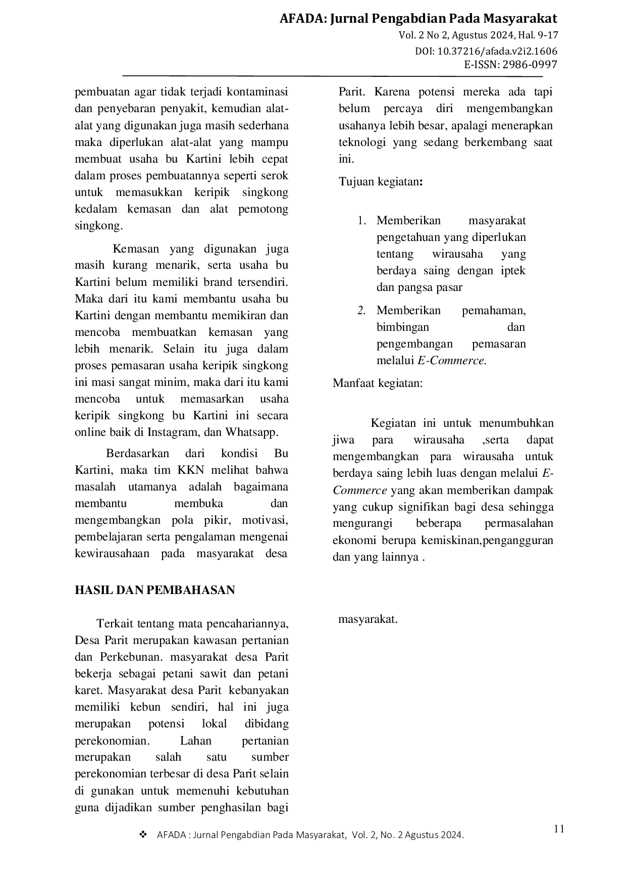 AFADA: Jurnal Pengabdian Pada MasyarakatAFADA: Jurnal Pengabdian Pada MasyarakatKuliah Kerja Nyata (KKN) merupakan sebuah kegiatan pengabdian kepada masyarakat yang melibatkan mahasiswa dari berbagai fakultas di Universitas PGRI Palembang dan Dosen pembimbing lapangan. Kegiatan KKN di Desa Parit Program ini berlangsung selama tiga minggu dan berkonsentrasi pada pengembangan usaha mikro, kecil, dan menengah (UMKM) yang masih membutuhkan pemberdayaan untuk meningkatkan kesejahteraan masyarakat. Permasalahan yang dihadapi di Desa Parit adalah masyarakat masih kurang berwirausaha. Oleh karena itu, perlu memotivasi masyarakat untuk berwirausaha. Pendampingan diberikan kepada salah satu wirausaha yang berpotensi berkembang dan kewirausahaannya mumpuni untuk lebih maju lagi jika dipasarkan lebih luas. Tujuan dari pendampingan kewirausahaan ini adalah agar mahasiswa paham bagaimana cara memproduksi keripik singkong dan memberikan arahan terhadap wirausaha untuk mengembangkan usahanya. Berkembangnya Keripik Singkong dengan kemasan dan pemasaran yang lebih kontemporer adalah hasil dari berbagai upaya pengabdian ini. Rekomendasi yang bisa kami berikan kepada masyarakat Desa Parit adalah memanfaatkan internet dan mengikuti perkembangan pasar digital. Hal ini juga diharapkan dapat meningkatkan kepercayaan diri setiap pengusaha dalam memulai usahanya.