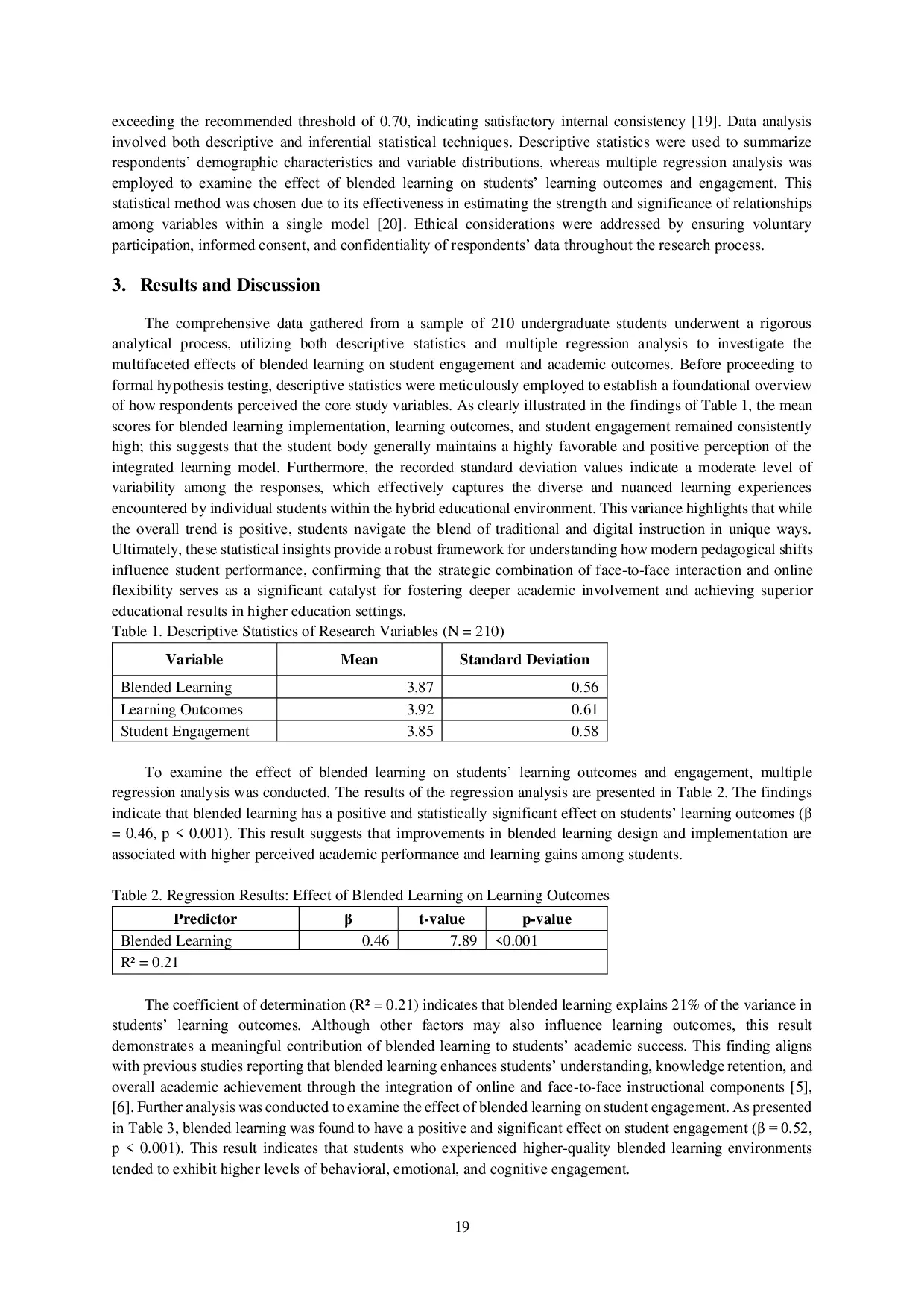 Penelitian ini memberikan bukti empiris bahwa pembelajaran blended memiliki pengaruh positif dan signifikan terhadap hasil belajar serta keterlibatan siswa di perguruan tinggi.Efek yang lebih kuat teramati pada keterlibatan siswa, menunjukkan bahwa keterlibatan aktif mendorong peningkatan kinerja akademik.Temuan ini menegaskan pentingnya desain instruksional yang baik dan dukungan institusional dalam implementasi pembelajaran blended.