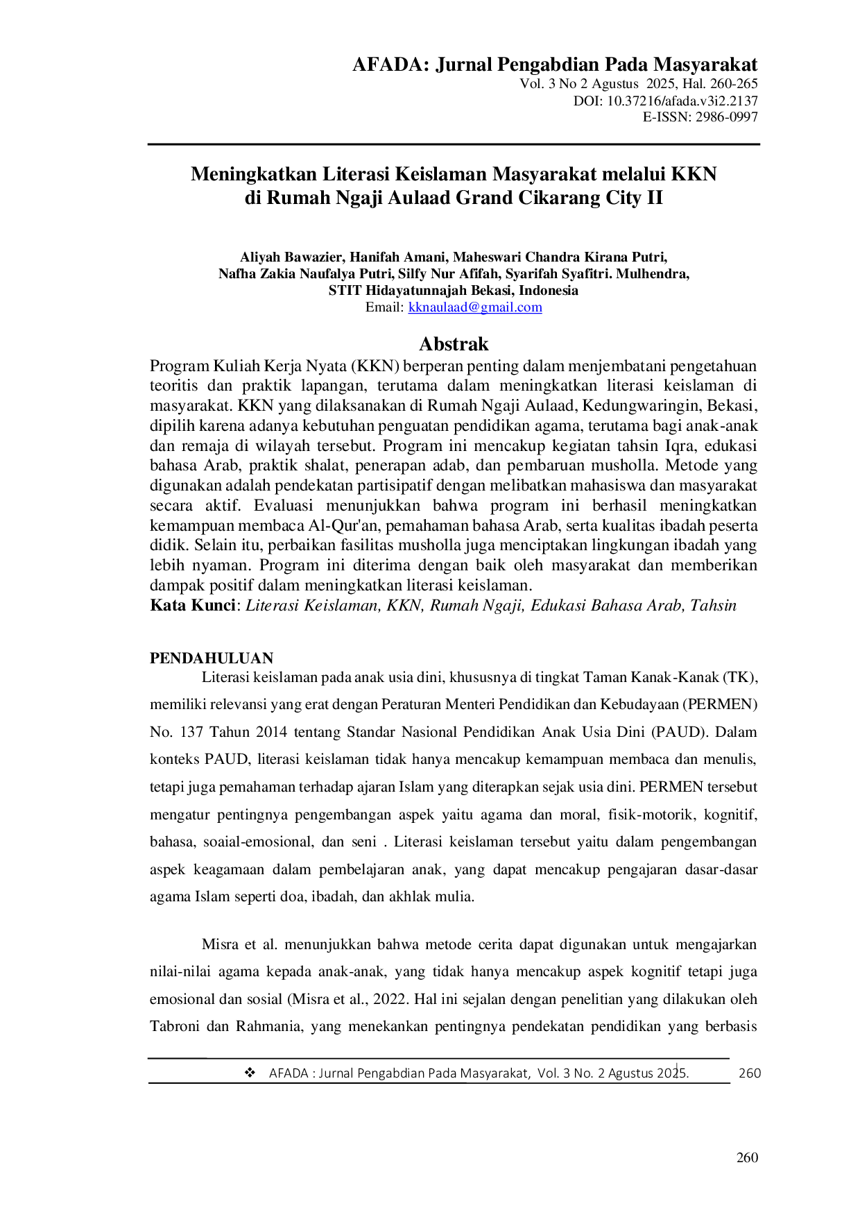 AFADA: Jurnal Pengabdian Pada MasyarakatAFADA: Jurnal Pengabdian Pada MasyarakatProgram Kuliah Kerja Nyata (KKN) berperan penting dalam menjembatani pengetahuan teoritis dan praktik lapangan, terutama dalam meningkatkan literasi keislaman di masyarakat. KKN yang dilaksanakan di Rumah Ngaji Aulaad, Kedungwaringin, Bekasi, dipilih karena adanya kebutuhan penguatan pendidikan agama, terutama bagi anak-anak dan remaja di wilayah tersebut. Program ini mencakup kegiatan tahsin Iqra, edukasi bahasa Arab, praktik shalat, penerapan adab, dan pembaruan musholla. Metode yang digunakan adalah pendekatan partisipatif dengan melibatkan mahasiswa dan masyarakat secara aktif. Evaluasi menunjukkan bahwa program ini berhasil meningkatkan kemampuan membaca Al-Quran, pemahaman bahasa Arab, serta kualitas ibadah peserta didik. Selain itu, perbaikan fasilitas musholla juga menciptakan lingkungan ibadah yang lebih nyaman. Program ini diterima dengan baik oleh masyarakat dan memberikan dampak positif dalam meningkatkan literasi keislaman.