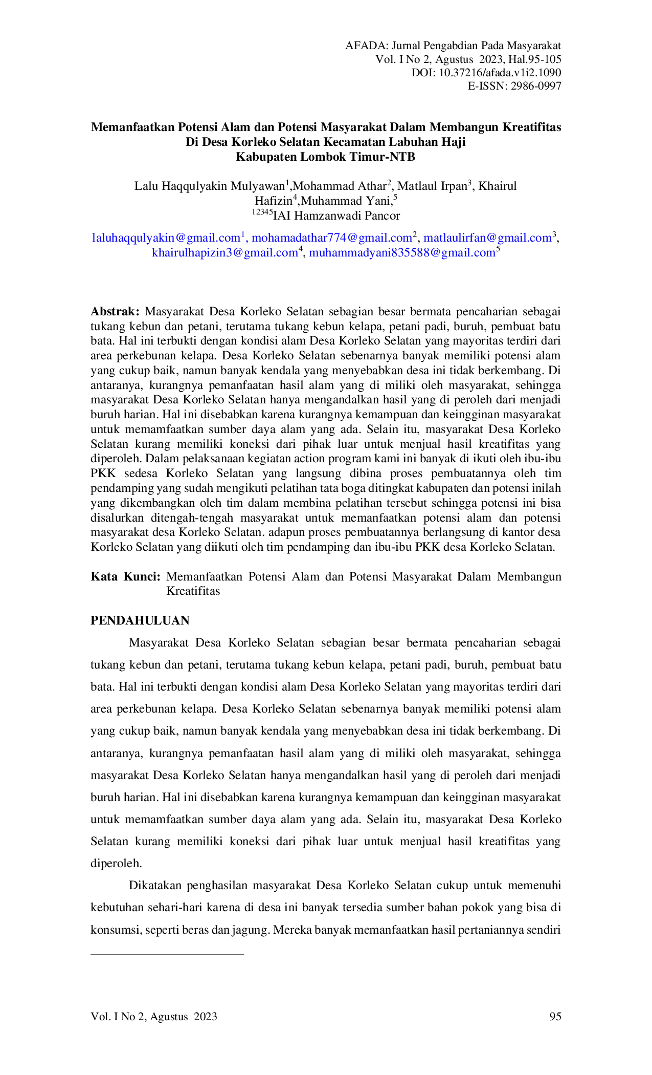 AFADA: Jurnal Pengabdian Pada MasyarakatAFADA: Jurnal Pengabdian Pada MasyarakatMasyarakat Desa Korleko Selatan sebagian besar bermata pencaharian sebagai tukang kebun dan petani, terutama tukang kebun kelapa, petani padi, buruh, dan pembuat batu bata. Desa ini memiliki potensi alam yang cukup baik, namun terkendala kurangnya pemanfaatan hasil alam oleh masyarakat, sehingga mereka hanya mengandalkan upah harian. Hal ini disebabkan oleh kurangnya kemampuan dan keinginan masyarakat untuk memanfaatkan sumber daya alam yang ada, serta kurangnya koneksi untuk menjual hasil kreativitas. Program pendampingan ini melibatkan ibu-ibu PKK dalam pelatihan tata boga dan pemanfaatan potensi alam serta masyarakat desa Korleko Selatan.