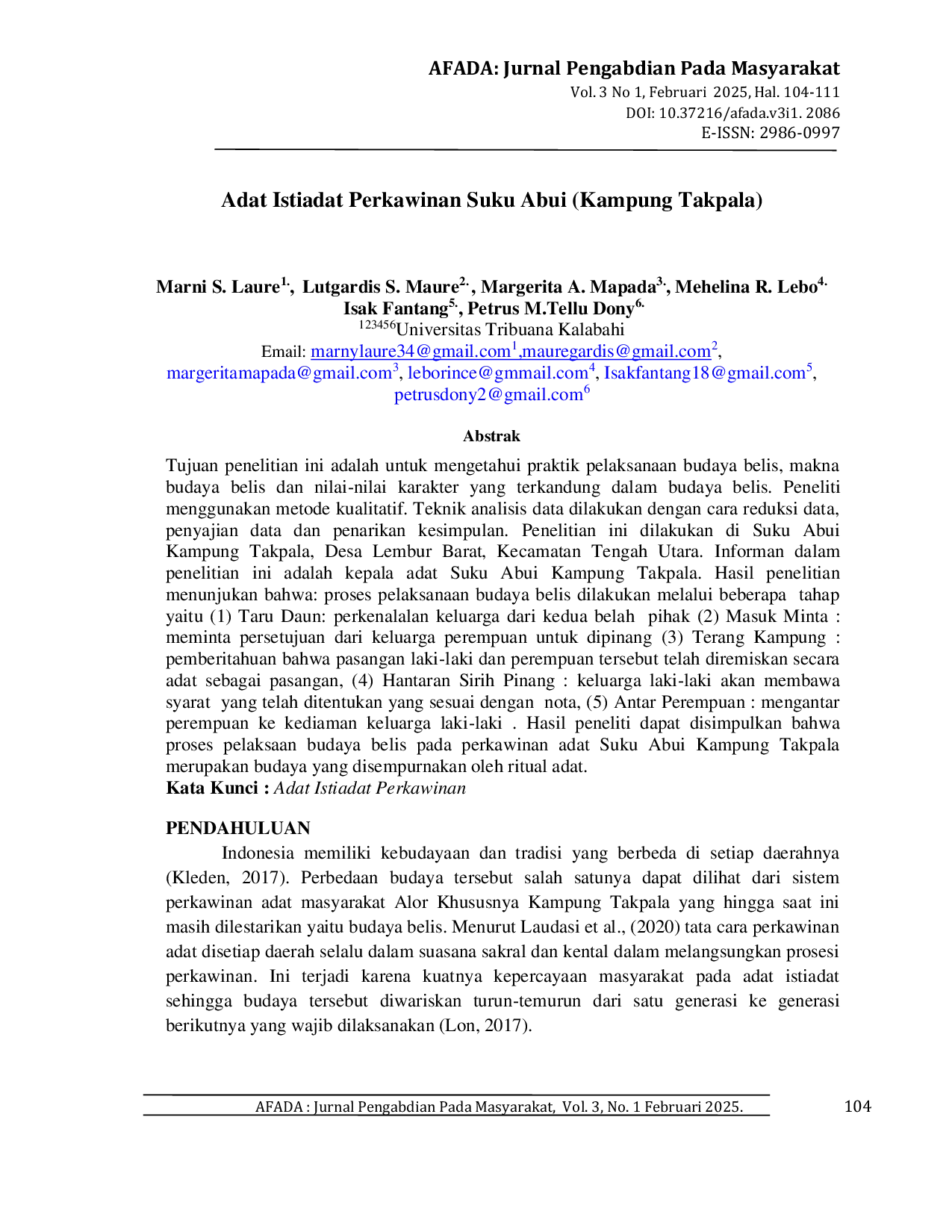 AFADA: Jurnal Pengabdian Pada MasyarakatAFADA: Jurnal Pengabdian Pada MasyarakatTujuan penelitian ini adalah untuk mengetahui praktik pelaksanaan budaya belis, makna budaya belis dan nilai-nilai karakter yang terkandung dalam budaya belis. Peneliti menggunakan metode kualitatif. Teknik analisis data dilakukan dengan cara reduksi data, penyajian data dan penarikan kesimpulan. Penelitian ini dilakukan di Suku Abui Kampung Takpala, Desa Lembur Barat, Kecamatan Tengah Utara. Informan dalam penelitian ini adalah kepala adat Suku Abui Kampung Takpala. Hasil penelitian menunjukan bahwa: proses pelaksanaan budaya belis dilakukan melalui beberapa tahap yaitu (1) Taru Daun: perkenalalan keluarga dari kedua belah pihak (2) Masuk Minta: meminta persetujuan dari keluarga perempuan untuk dipinang (3) Terang Kampung: pemberitahuan bahwa pasangan laki-laki dan perempuan tersebut telah diremiskan secara adat sebagai pasangan, (4) Hantaran Sirih Pinang: keluarga laki-laki akan membawa syarat yang telah ditentukan yang sesuai dengan nota, (5) Antar Perempuan: mengantar perempuan ke kediaman keluarga laki-laki. Hasil peneliti dapat disimpulkan bahwa proses pelaksaan budaya belis pada perkawinan adat Suku Abui Kampung Takpala merupakan budaya yang disempurnakan oleh ritual adat.