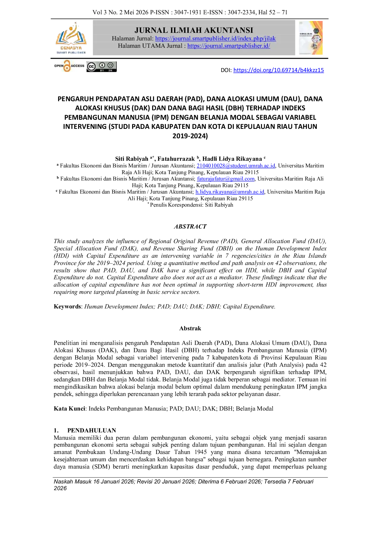 Jurnal Ilmiah AkuntansiJurnal Ilmiah AkuntansiPenelitian ini menganalisis pengaruh Pendapatan Asli Daerah (PAD), Dana Alokasi Umum (DAU), Dana Alokasi Khusus (DAK), dan Dana Bagi Hasil (DBH) terhadap Indeks Pembangunan Manusia (IPM) dengan Belanja Modal sebagai variabel intervening pada 7 kabupaten/kota di Provinsi Kepulauan Riau periode 2019–2024. Dengan menggunakan metode kuantitatif dan analisis jalur (Path Analysis) pada 42 observasi, hasil menunjukkan bahwa PAD, DAU, dan DAK berpengaruh signifikan terhadap IPM, sedangkan DBH dan Belanja Modal tidak. Belanja Modal juga tidak berperan sebagai mediator. Temuan ini mengindikasikan bahwa alokasi belanja modal belum optimal dalam mendukung peningkatan IPM jangka pendek, sehingga diperlukan perencanaan yang lebih terarah pada sektor pelayanan dasar.