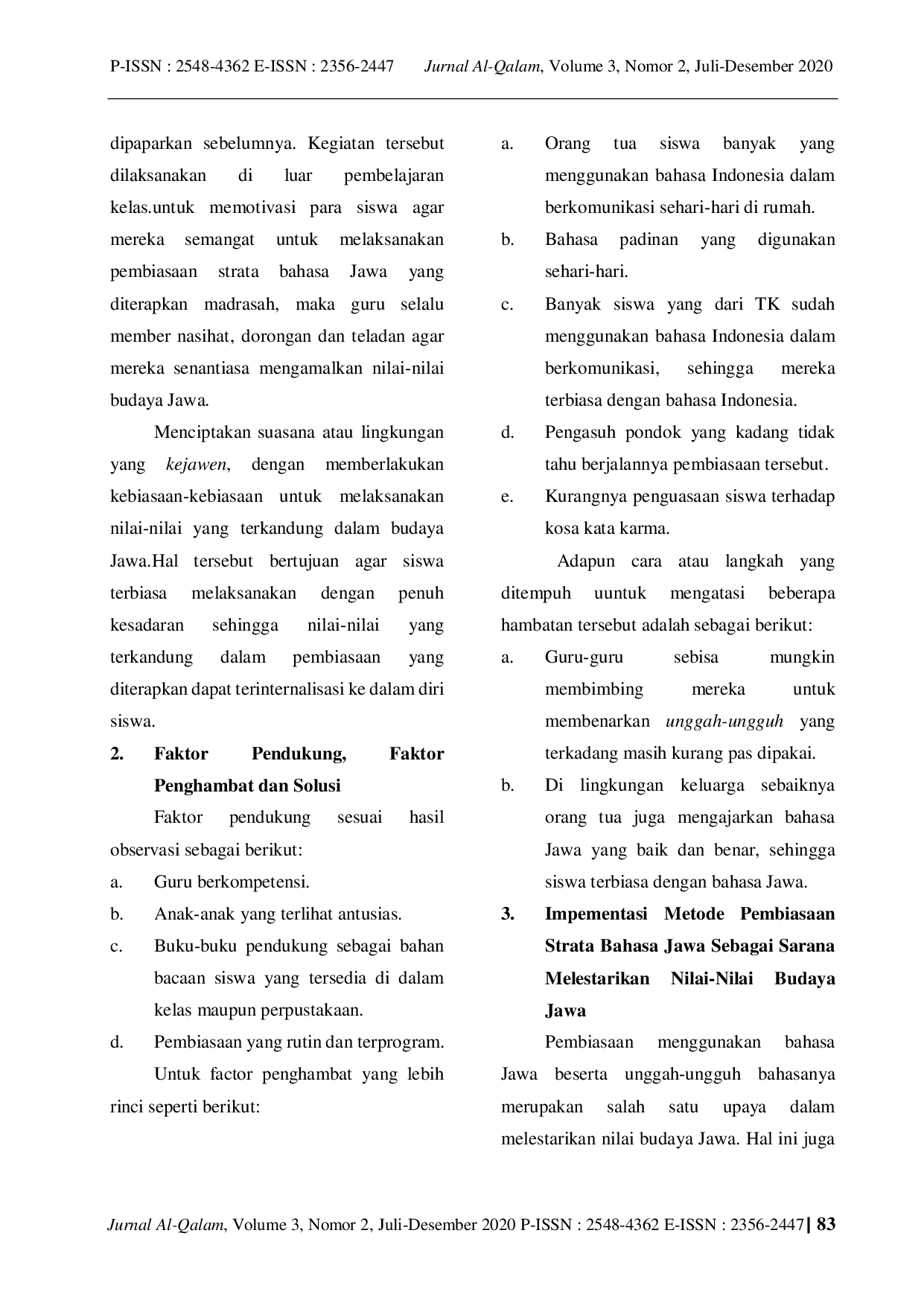 AL-QALAM: JURNAL KEPENDIDIKANAL-QALAM: JURNAL KEPENDIDIKANTujuan dari penelitian ini yaitu untuk 1) mengetahui penerapan strata bahasa di MI Maarif Kliwonan, 2) mengetahui apa saja yang menjadi faktor pendukung dan penghambat dalam implementasi metode pembiasaan strata bahasa dan bagaimana solusinya, dan 3) mengetahui implementasi metode pembiasaan strata bahasa bisa dikatakan sebagai sarana melestarikan nilai-nilai budaya Jawa. Jenis penelitian yang digunakan adalah penelitian kualitatif deskriptif. Penelitian ini mengumpulkan informasi dengan metode observasi, wawancara, dan dokumentasi. Hasil Penelitian menunjukkan bahwa metode pembiasaan strata bahasa Jawa yang dilakukan secara rutin dan terprogram kepada siswa mampu mewarisi nilai budaya Jawa yang belakangan ini hampir luntur. Sehingga, generasi muda tidak lagi merasa malu menggunakan kekayaan budaya berkomunikasi dengan menggunakan bahasa Jawa yang baik dan benar. Metode pembiasaan strata bahasa Jawa dijadikan sebagai sarana melestarikan nilai budaya Jawa secara umum yaitu sebagai penghubung musnahnya budaya Jawa di era globalisasi.