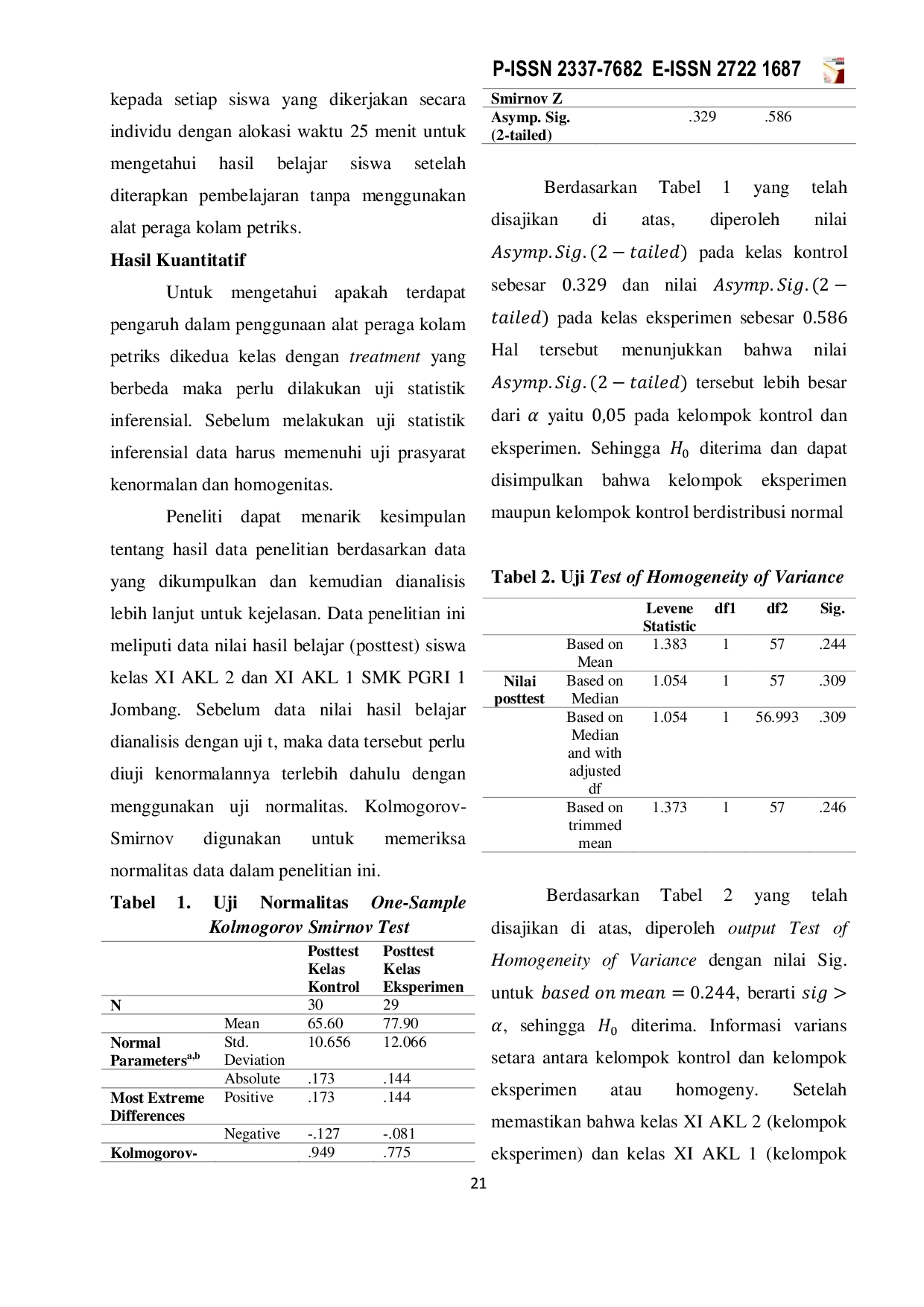 EdumathEdumathPenelitian ini menggunakan rancangan penelitian kuantitatif eksperimen Quasi Experimental Design dengan Posttest Only Control Design. Tujuan dalam penelitian ini adalah untuk mengetahui ada atau tidaknya pengaruh penggunaan alat peraga kolam petriks terhadap hasil belajar matematika siswa SMK PGRI 1 Jombang pada materi matriks ordo 2 × 2. Populasi yang digunakan yaitu seluruh siswa kelas XI di SMK PGRI 1 Jombang tahun ajaran 2022/2023. Pengambilan sampel menggunakan teknik cluster random sampling. Dari undian sampel pertama diperoleh kelas eksperimen yaitu kelas XI AKL 2 berjumlah 30 siswa, dan undian sampel kedua sebagai kelas kontrol yaitu XI AKL 1 yang berjumlah 29 siswa. Metode pengumpulan data dilakukan dengan menggunakan lembar instrumen berupa lembar tes hasil belajar. Data yang diperoleh dari nilai hasil belajar siswa (posttest) dianalisis untuk menguji hipotesis penelitian dengan menggunakan uji perbedaan rata-rata dua sampel bebas (Independent sample t-test). Berdasarkan hasil analisis menggunakan aplikasi SPSS 20.0 for windows diperoleh nilai Sig(2 − tailed) sebesar 0.000 maka nilai sig < α = 0.000 < 0.05 sehingga Ho ditolak yang berarti terdapat perbedaan rata-rata hasil belajar matematika siswa pada kedua sampel. Dengan adanya perbedaan tersebut dapat disimpulkan bahwa ada pengaruh terhadap hasil belajar matematika siswa kelas XI di SMK PGRI 1 Jombang yang diberi pembelajaran dengan dan tanpa menggunakan alat peraga kolam petriks.