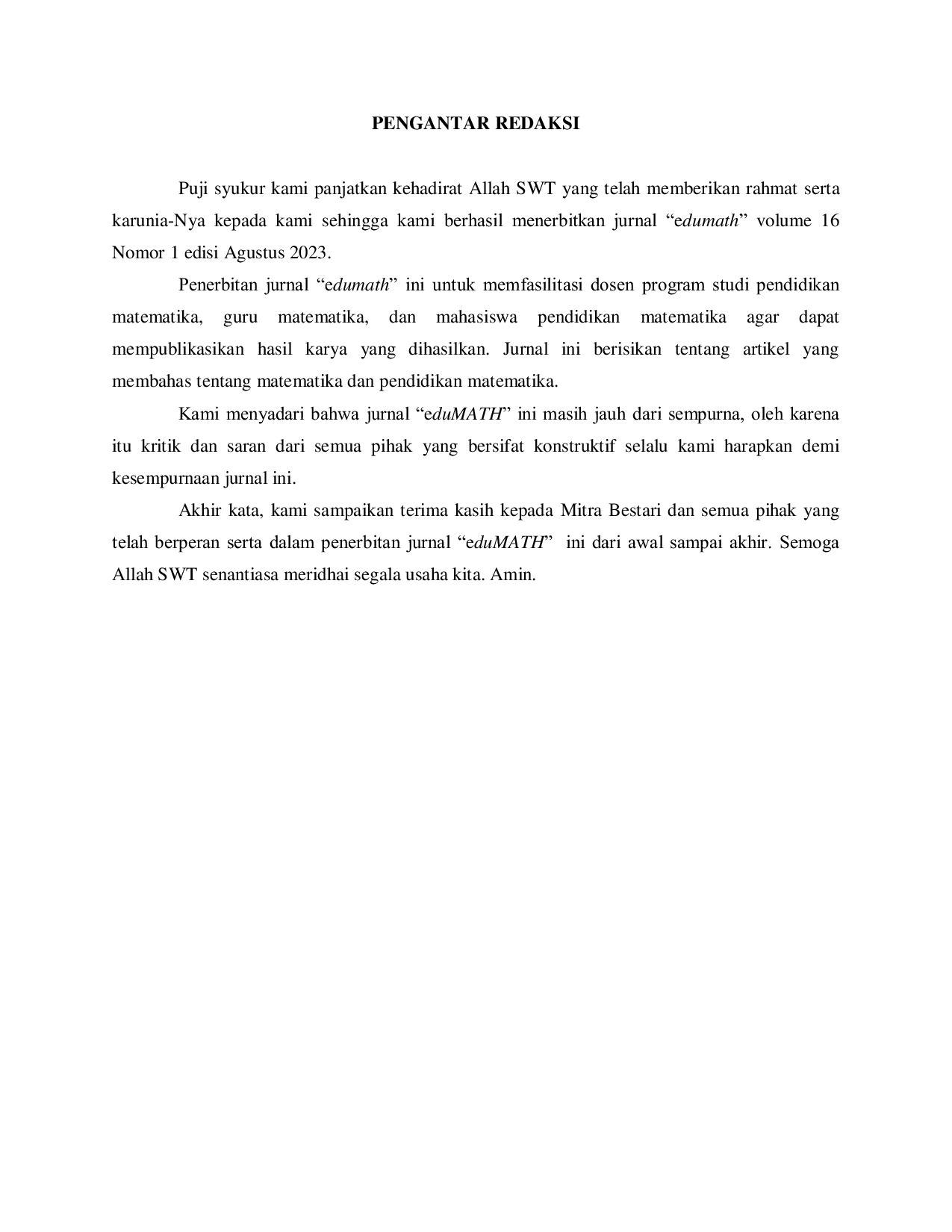 EdumathEdumathIndonesia terdiri beberapa etik yang menganut agama kepercayaan yang berbeda-beda, memiliki berbagai macam Bahasa, serta memiliki berbagai suku diantaranya suku jawa. Sejarah islam di Jombang kurang diketahu oleh masyarakat sekitar, padahal mayoritas masyarakat Jombang beragama islam. Pada kota Jombang terdapat Masjid Agung Baitul Mukminin Jombang yang lokasinya berada di tengah-tengah pusat kota dan berdekatan dengan alun-alun kota Jombang. Arsitektur bangungan masjid sebelumnya memiliki konsep bagian dalam berbentuk persegi, dan sedikit sempit ketimbang serambi yang lebar. Bangunan dan ornamen dari masjid ini, ditemukan beberapa etnomatika yang berkaitan dengan konsep geometri. Berdasarkan hal tersebut, peneliti tertarik untuk melakukan eksplorasi terkait konsep geometri yang terdapat pada bangunan dan ornamen Masjid Agung Baitul Mukminin. Penelitian ini bertujuan mengetahui unsur-unsur etnomatematika materi geometri sekolah dasar yang terdapat pada arsitektur Masjid Agung Baitul Mukminin Jombang. Penelitian ini menggunakan jenis penelitian kualitatif dengan pendekatan etnografi. Teknik pengumpulan data yang digunakan pada penelitian ini yakni observasi, wawancara dan dokumentasi. Sumber data pada penelitian ini adalah hasil wawancara yang didapatkan dari informan serta observasi secara langsung. Pada penelitian ini terdapat tiga tahap pengumpulan data yaitu tahap pra lapangan, tahap kegiatan lapangan dan tahap analisis data. Berdasarkan hasil observasi dan wawancara, bangunan dan ornamen pada Masjid Agung Baitul Mukminin Jombang terdapat suatu konsep matematika dimana berfokus pada materi geometri sekolah dasar. Pembelajaran matematika yang berkaitan dengan konsep geometri, yaitu bangun bidang dan bangun ruang. Konsep geometri berupa bangun bidang yang dapat ditemukan pada bangunan dan ornamen Masjid Agung Baitul Mukminin Jombang adalah persegi panjang, lingkaran, belah ketupat, persegi, segitiga, dan layang-layang. Sedangkan konsep geometri berupa bangun ruang yang dapat ditemukan pada bangunan dan ornamen Masjid Agung Baitul Mukminin Jombang adalah limas segiempat, bola, balok, kubus, dan tabung. Masjid Agung Baitul Mukminin Jombang juga dapat dimanfaatkan oleh guru dalam pembelajaran matematika yakni untuk memperkenalkan konsep matematika kepada siswa dengan melalui budaya lokal.