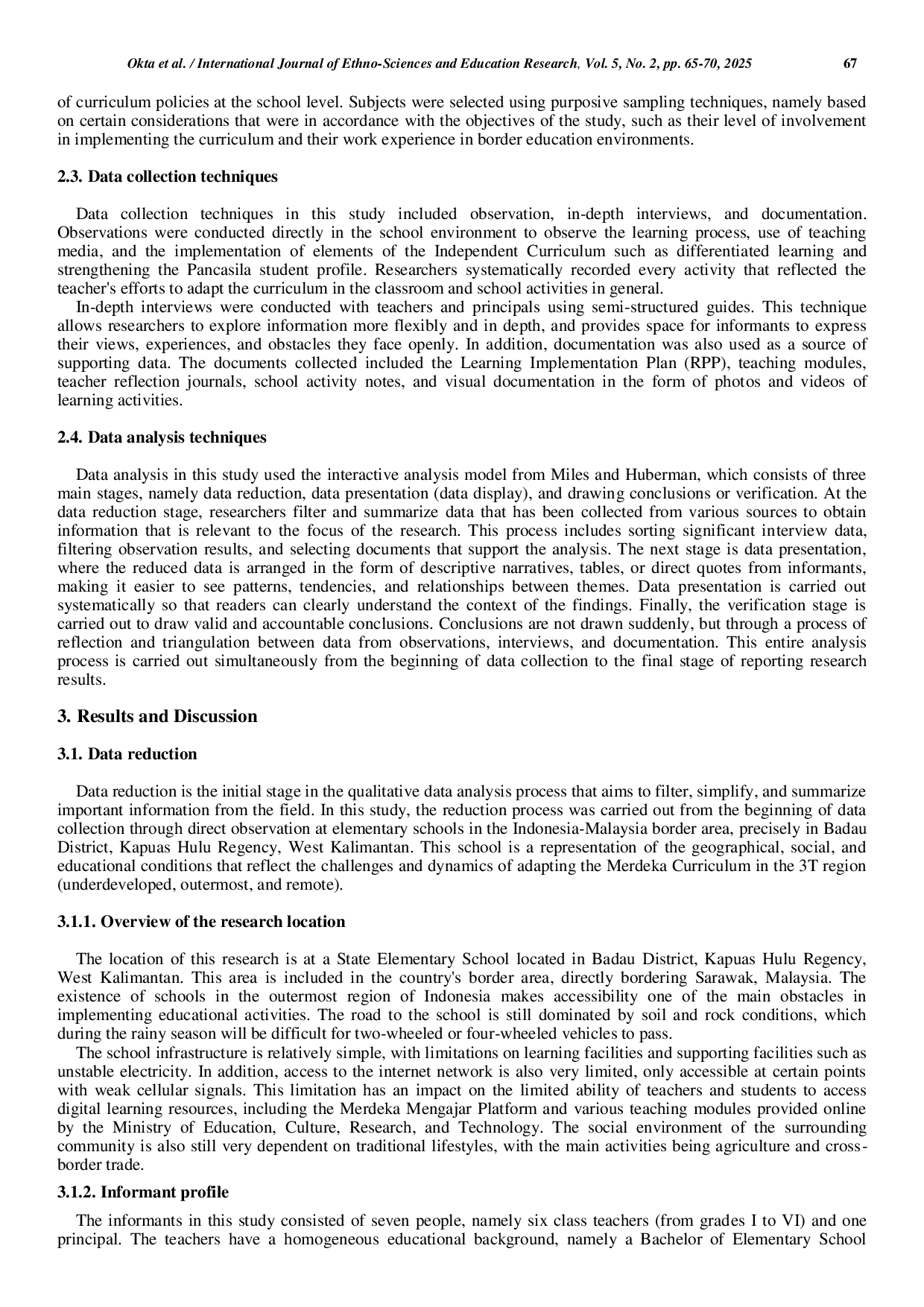 International Journal of Ethno-Sciences and Education ResearchInternational Journal of Ethno-Sciences and Education ResearchThis study examines the process of adapting the Merdeka Curriculum by elementary school teachers in the Indonesia-Malaysia border area, especially in Kapuas Hulu Regency, West Kalimantan. Using a descriptive qualitative approach and case study method, this study aims to explore adaptation strategies, implementation challenges, and leadership roles in implementing the new curriculum in the 3T (underdeveloped, outermost, and frontier) areas. Data were collected through direct observation, in-depth interviews with six class teachers and one principal, and analysis of learning documentation. The results of the study indicate that teachers understanding of the basic concepts of the Merdeka Curriculum such as differentiated learning and the Pancasila Student Profile has not been accompanied by adequate technical skills in its implementation. Teachers developed adaptation strategies in the form of simplifying materials, using local content such as folklore and traditional games, and informal collaboration in developing learning. The main challenges to implementation include limited infrastructure (45%), minimal teacher training (30%), and conventional learning culture (25%). The role of the principal as a facilitator and coordinator is very significant in overcoming implementation gaps. This study concludes that the adaptation of the Merdeka Curriculum in border areas requires a flexible and contextual approach by considering local geographic, socio-economic conditions, and human resource capacity. Place-based policies and strengthening collaboration between schools, local governments, and communities are needed to realize the implementation of a just and equitable curriculum throughout Indonesia.