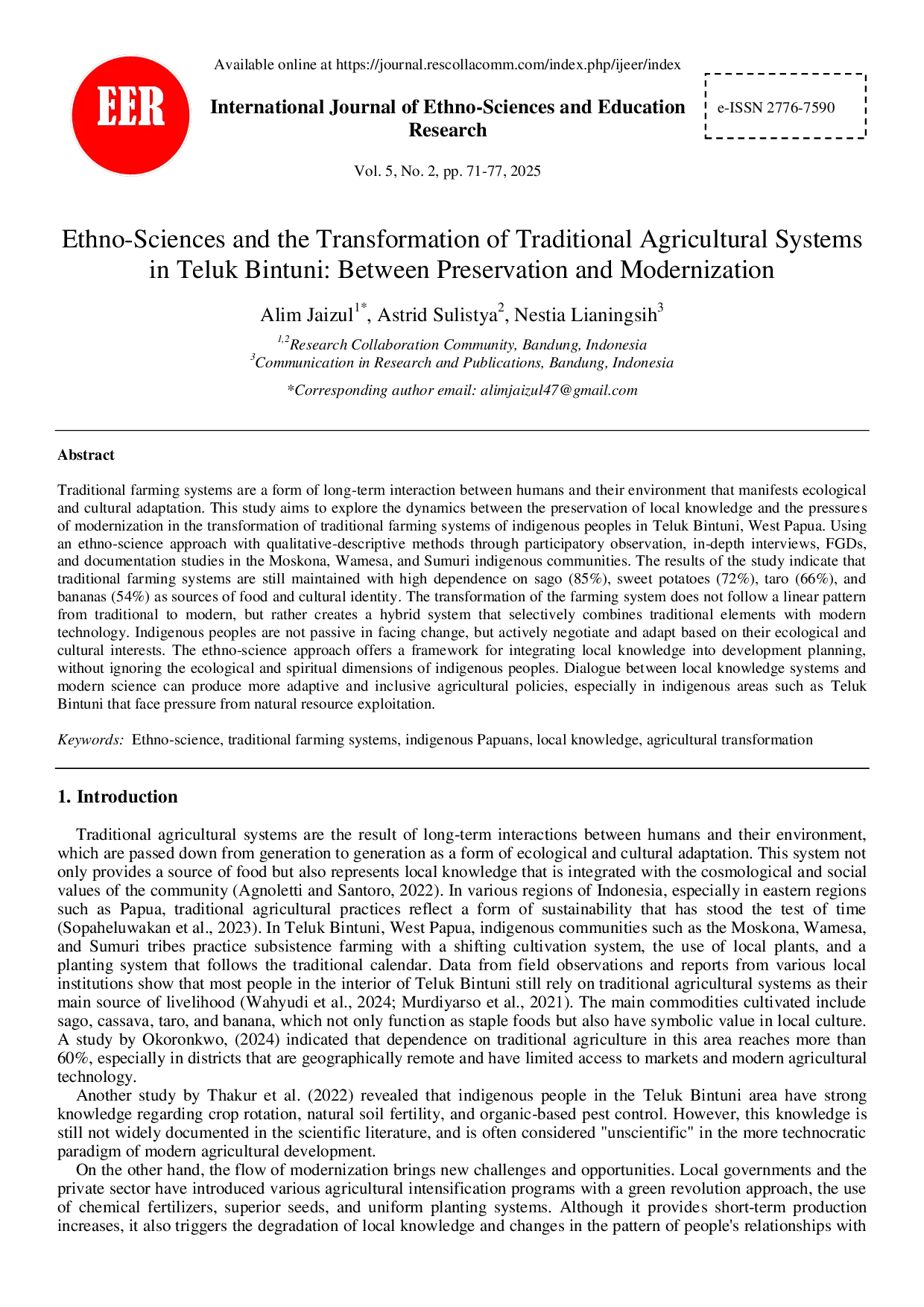 International Journal of Ethno-Sciences and Education ResearchInternational Journal of Ethno-Sciences and Education ResearchSistem pertanian tradisional adalah bentuk interaksi jangka panjang antara manusia dan lingkungannya yang mencerminkan adaptasi ekologis dan budaya. Penelitian ini bertujuan untuk mengeksplorasi dinamika antara pelestarian pengetahuan lokal dan tekanan modernisasi dalam transformasi sistem pertanian tradisional masyarakat adat di Teluk Bintuni, Papua Barat. Dengan menggunakan pendekatan ethno-science dan metode kualitatif-deskriptif melalui observasi partisipatif, wawancara mendalam, FGD, dan studi dokumentasi di komunitas Moskona, Wamesa, dan Sumuri. Hasil penelitian menunjukkan bahwa sistem pertanian tradisional masih dipertahankan dengan ketergantungan tinggi pada sagu (85%), ubi jalar (72%), talas (66%), dan pisang (54%) sebagai sumber makanan dan identitas budaya. Transformasi sistem pertanian tidak mengikuti pola linier dari tradisional ke modern, tetapi menciptakan sistem hibrida yang secara selektif menggabungkan unsur-unsur tradisional dengan teknologi modern. Masyarakat adat tidak pasif dalam menghadapi perubahan, tetapi secara aktif bernegosiasi dan beradaptasi berdasarkan kepentingan ekologis dan budaya mereka. Pendekatan ethno-science menawarkan kerangka kerja untuk mengintegrasikan pengetahuan lokal ke dalam perencanaan pembangunan, tanpa mengabaikan dimensi ekologis dan spiritual masyarakat adat. Dialog antara sistem pengetahuan lokal dan sains modern dapat menghasilkan kebijakan pertanian yang lebih adaptif dan inklusif, terutama di daerah adat seperti Teluk Bintuni yang menghadapi tekanan dari eksploitasi sumber daya alam.
