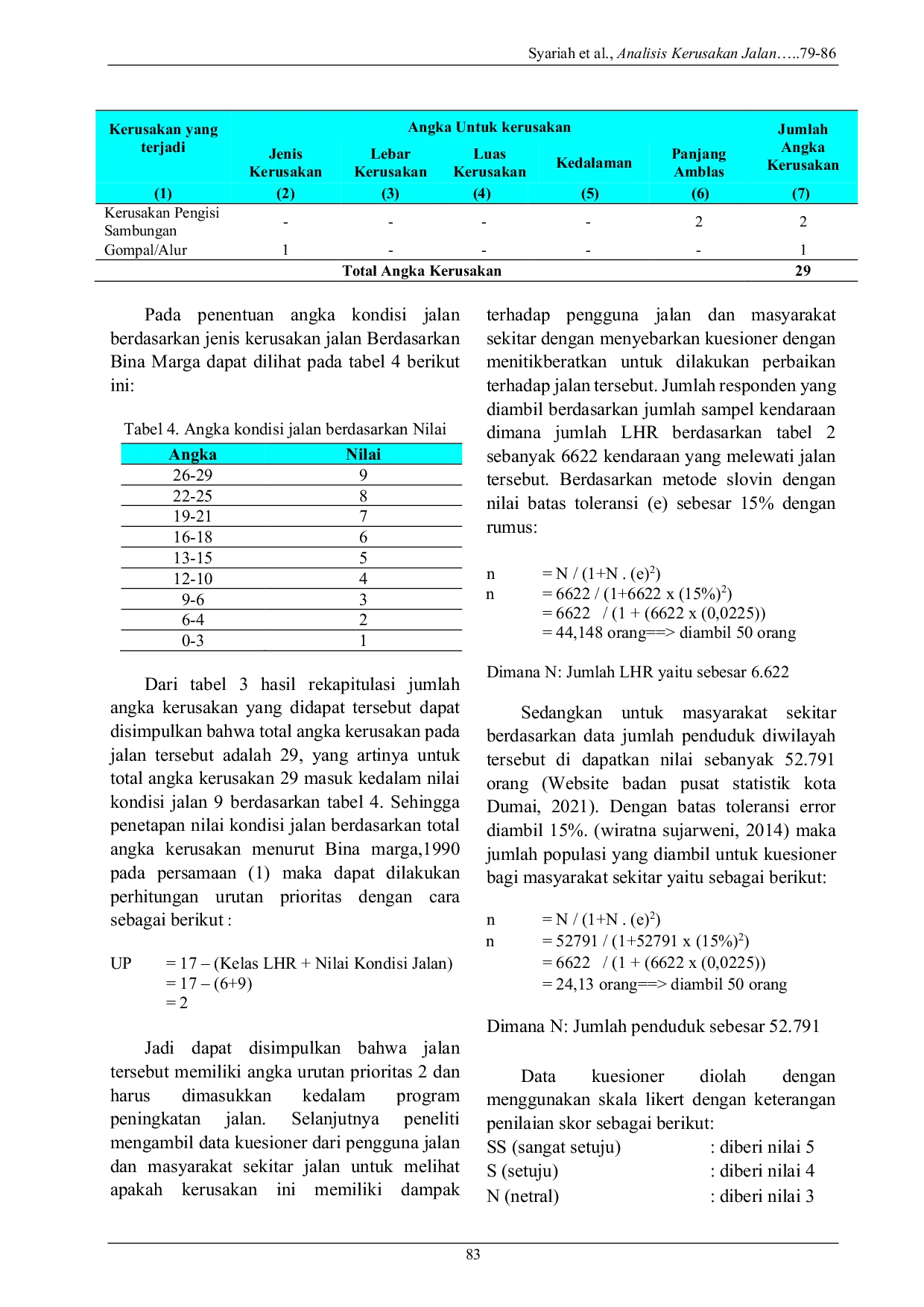FROPIL (Forum Profesional Teknik Sipil)FROPIL (Forum Profesional Teknik Sipil)Jalan Nasional Lintas Timur Simpang Pangat merupakan jaringan jalan untuk distribusi barang dan jasa (kegiatan antar nasional). Penelitian ini dilakukan bertujuan untuk mengetahui jenis-jenis kerusakan yang terjadi dengan mengamati kondisi perkerasan jalan langsung dan penyebaran kusioner/angket kepada 50 responden, menggunakan Metode Binamarga. Berdasarkan hasil kerusakan jalan jenis kerusakanya adalah retak memanjang, lubang, pecah sudut, kerusakan tekstur permukaan, tambalan dan beda tinggi badan terhadap bahu jalan, dengan angka urutan prioritas yang di dapat yaitu angka 2 dari rentang UP 0-7 maka nilai 2 masuk pada kategori berat dan harus di masukan kedalam peningkatan, sedangkan hasil pengaruh menggunakan metode skala likert didapatkan hasil angka sebesar 83,2 % bagi pengguna jalan dan 84,0 % bagi masyarakat sekitar jalan tersebut dan dipastikan kembali menggunakan data pengaruh kerusakan jalan terhadap masyarakat dan pengguna jalan menggunakan aplikasi SPSS didapatkan nilai rata-rata yang diperoleh dari data kusioner tersebut adalah : 3,76 dan masuk kedalam kategori Intrepretation Hight/ Tinggi dengan standar deviasi = 1,287 dimana jalan wajib dilakukan perbaikan.