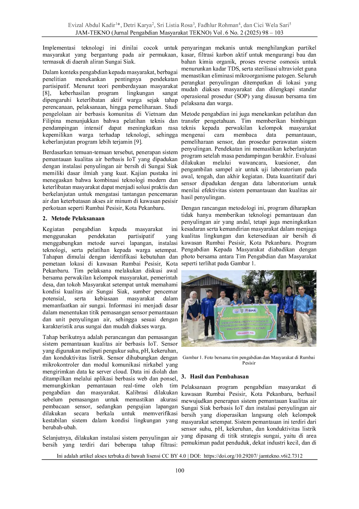 Jurnal Pengabdian Masyarakat TEKNOJurnal Pengabdian Masyarakat TEKNOProgram pengabdian kepada masyarakat ini bertujuan untuk meningkatkan ketersediaan air bersih dan kesadaran lingkungan melalui penerapan sistem pemantauan kualitas air Sungai Siak serta instalasi penyulingan air bersih bagi kelompok masyarakat di Kecamatan Rumbai Pesisir, Kota Pekanbaru, Riau. Kegiatan diawali dengan koordinasi bersama pemangku kepentingan lokal, dilanjutkan survei lokasi untuk menentukan titik pemantauan dan area instalasi unit penyulingan. Perangkat sensor berbasis Internet of Things (IoT) digunakan untuk memantau parameter utama seperti suhu, pH, dan tingkat kekeruhan air secara real-time, sedangkan sistem penyulingan multi-tahap menggabungkan filtrasi karbon aktif, reverse osmosis, dan sterilisasi ultraviolet diterapkan untuk menghasilkan air yang layak konsumsi. Hasil pelaksanaan menunjukkan bahwa sistem pemantauan dapat mengirimkan data kualitas air secara daring dan membantu masyarakat mengenali perubahan kondisi sungai secara cepat, khususnya pada musim hujan ketika kekeruhan meningkat. Unit penyulingan yang dipasang di balai warga menghasilkan air dengan kualitas yang memenuhi standar air minum rumah tangga, memberikan alternatif sumber air bersih yang mudah diakses. Keterlibatan aktif masyarakat dalam pelatihan pengoperasian dan perawatan perangkat memastikan keberlanjutan program serta menumbuhkan rasa kepemilikan bersama. Secara keseluruhan, kegiatan ini membuktikan bahwa kombinasi pemantauan kualitas air berbasis sensor IoT dan teknologi penyulingan dapat menjadi solusi praktis dan berkelanjutan dalam mengatasi permasalahan air bersih di wilayah bantaran Sungai Siak, sekaligus mendukung upaya pelestarian lingkungan dan peningkatan kesehatan masyarakat setempat.