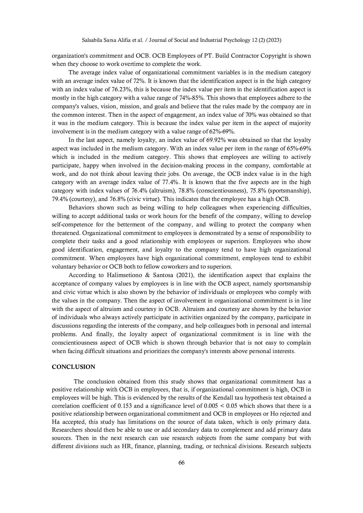 Penelitian ini menyimpulkan bahwa komitmen organisasi memiliki hubungan positif dengan OCB pada karyawan, yaitu semakin tinggi komitmen organisasi, semakin tinggi pula OCB.Hasil uji hipotesis menunjukkan koefisien korelasi Kendall tau sebesar 0,153 dan tingkat signifikansi 0,005 < 0,05, sehingga hipotesis nol ditolak dan hipotesis alternatif diterima.Keterbatasan penelitian ini meliputi penggunaan data primer saja, sehingga disarankan penelitian lanjutan dapat melengkapi dengan data sekunder dan memperluas subjek penelitian ke divisi atau level jabatan yang berbeda.