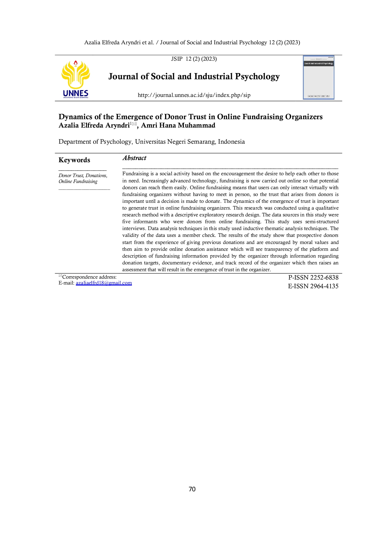 Journal of Social and Industrial PsychologyJournal of Social and Industrial PsychologyFundraising adalah kegiatan sosial berdasarkan dorongan keinginan untuk saling membantu kepada mereka yang membutuhkan. Semakin majunya teknologi, penggalangan dana sekarang dilakukan secara online sehingga calon donor dapat dengan mudah menjangkau mereka. Penggalangan dana online berarti pengguna hanya dapat berinteraksi secara virtual dengan penyelenggara penggalangan dana tanpa harus bertemu langsung, sehingga kepercayaan yang timbul dari donor penting hingga keputusan dibuat untuk berdonasi. Dinamika munculnya kepercayaan penting untuk menghasilkan kepercayaan pada penyelenggara penggalangan dana online. Penelitian ini dilakukan menggunakan metode penelitian kualitatif dengan desain penelitian eksploratori deskriptif. Sumber data dalam penelitian ini adalah lima informan yang merupakan donor dari penggalangan dana online. Penelitian ini menggunakan wawancara semi-terstruktur. Teknik analisis data dalam penelitian ini menggunakan teknik analisis tematik induktif. Validitas data menggunakan member check. Hasil penelitian menunjukkan bahwa calon donor mulai dari pengalaman memberikan donasi sebelumnya dan didorong oleh nilai-nilai moral dan kemudian bertujuan untuk memberikan bantuan donasi online yang akan melihat transparansi platform dan deskripsi informasi penggalangan dana yang diberikan oleh penyelenggara melalui informasi mengenai target donasi, bukti dokumenter, dan rekam jejak penyelenggara yang kemudian menimbulkan penilaian yang akan menghasilkan munculnya kepercayaan pada penyelenggara.