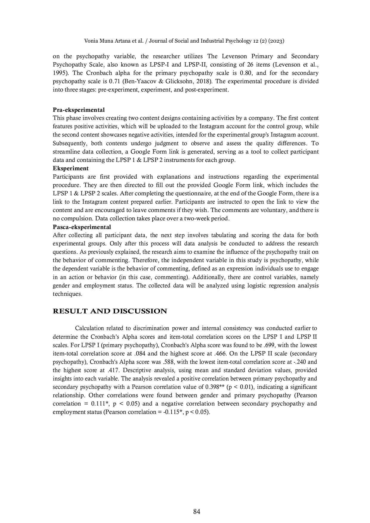 Journal of Social and Industrial PsychologyJournal of Social and Industrial PsychologyPersonality usually also influences the preferences or interests that a person has. This interest then triggers the desire in a person to behave well, both positive and negative behavior. Psychopathic psychology itself is described as selfish, lacking feelings of empathy and remorse, impulsive, manipulative, more selfish, and tends to be antisocial. Research related to psychopathy and commenting behavior on social media has not been carried out much. Therefore, this study aims to see the effect of psychopathic personality on behavior to give comments on social media. This research is a quantitative research using quasi-experimental methods and one group post-test design. Quota sampling is used as a sampling technique. The research managed to collect 380 respondents who were then divided into two different groups, namely the control group and the experimental group. Both groups will be given the same treatment according to the existing procedure. Data analysis was then performed using logistic regression analysis which was carried out twice. While the results of the study show a significance value of 0.049 between so that it reads that the hypothesis is accepted where secondary psychopathy has a negative effect on commenting behavior in the experimental group with posting negative content.