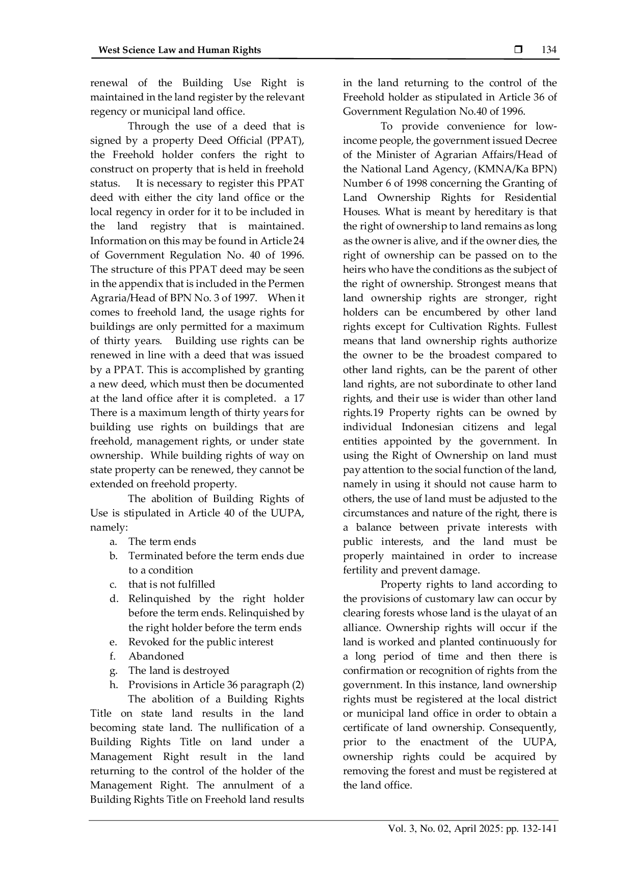 West Science Law and Human RightsWest Science Law and Human RightsBuilding Rights Title (HGB) which has expired according to the legislation will return to the original legal status of the land rights, namely returning to state land, management rights or individuals. This study examines the challenges associated with transitioning from Building Rights Title to Land Ownership Rights in Indonesia and the hurdles encountered in enhancing land rights. The employed research approach is normative juridical. The utilised data source is secondary data. The data collection method employs a literature review. Data processing is done by descriptive analytical method. Land with HGB status can be upgraded to Property Rights by applying for an increase in rights. However, in reality not all HGB can be upgraded to Property Rights. HGB that is on the land of a persons property rights and land management rights cannot be upgraded to Property Rights. In addition, HGB that is encumbered with a mortgage cannot be upgraded to Hak Milik as long as the debt has not been repaid.