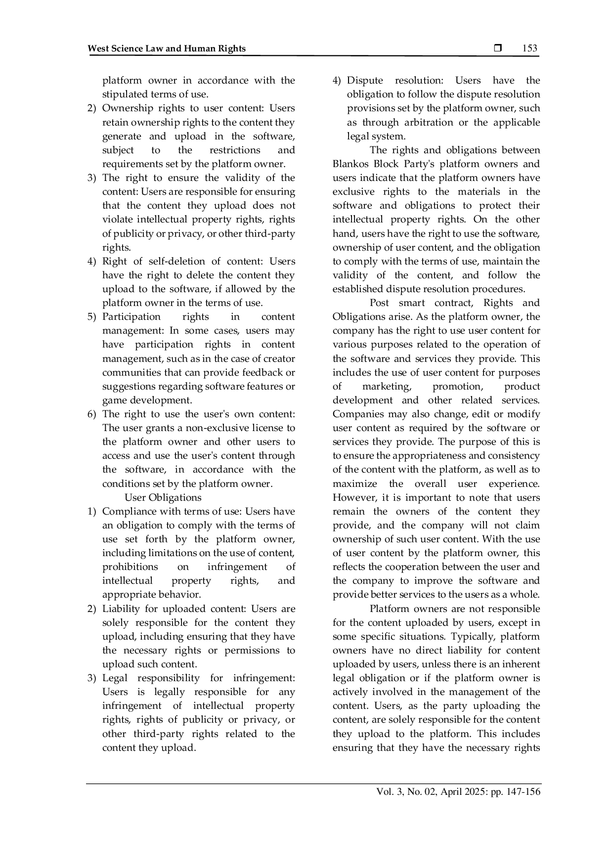 West Science Law and Human RightsWest Science Law and Human RightsPenelitian ini berfokus pada hubungan hukum antara pengguna dan pemilik platform dalam platform game online berbasis blockchain Blankos Block Party, terkait kepemilikan hak cipta. Selain itu, penelitian ini bertujuan untuk memahami hak dan kewajiban para pihak dalam menentukan perlindungan aset dan manfaat yang dapat diperoleh. Penelitian ini menggunakan metode normatif dengan pendekatan perundang-undangan dan pendekatan konseptual. Hasil penelitian ini menemukan bahwa pemilik platform memiliki hak kepemilikan eksklusif atas materi dalam perangkat lunak dan dapat mengatur penggunaan konten pengguna. Pengguna memiliki hak untuk menggunakan perangkat lunak dan kepemilikan atas konten yang mereka hasilkan, tetapi juga wajib mematuhi ketentuan penggunaan dan menjaga keabsahan konten. Pemilik platform bertanggung jawab untuk melindungi hak kekayaan intelektual pengguna, sementara pengguna bertanggung jawab atas konten yang diunggah dan harus mengamankan hak atau izin yang diperlukan.