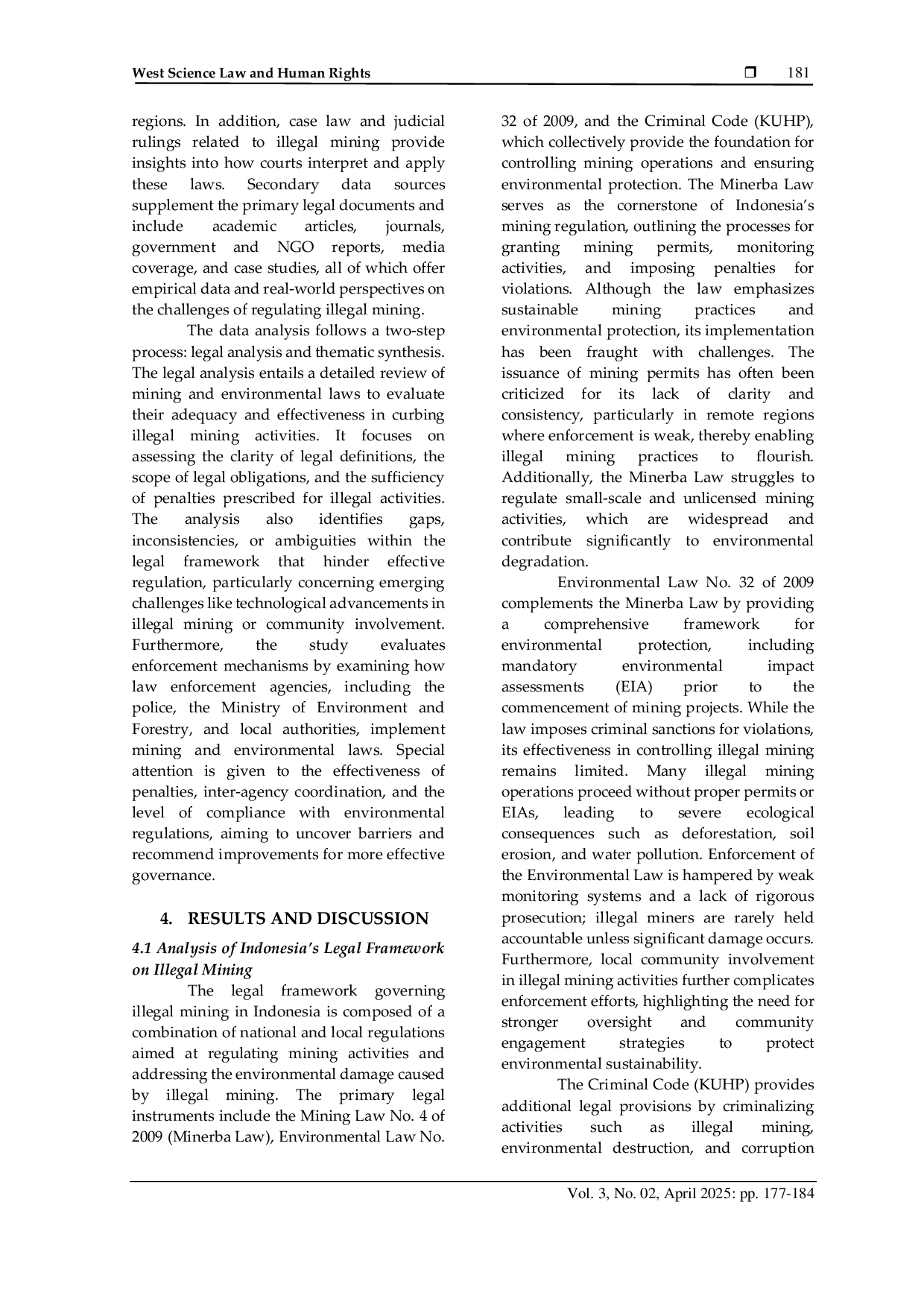 WESTSCIENCE PRESSWESTSCIENCE PRESS The study concludes that Law Number 32 of 2009 provides a comprehensive legal framework for addressing illegal mining and environmental damage, yet itsThe study concludes that Law Number 32 of 2009 provides a comprehensive legal framework for addressing illegal mining and environmental damage, yet its