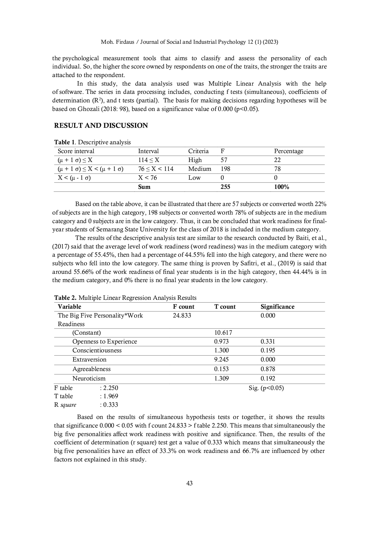 Journal of Social and Industrial PsychologyJournal of Social and Industrial PsychologyPengangguran merupakan salah satu permasalahan yang banyak dibahas, dan salah satu cara untuk mengurangi tingkat pengangguran adalah meningkatkan kesiapan kerja. Faktor yang memengaruhi kesiapan kerja adalah kepribadian. Dalam penelitian ini, teori yang digunakan untuk mengkaji kepribadian adalah big five personality. Populasi dalam penelitian ini adalah mahasiswa Universitas Negeri Semarang, dengan sampel mahasiswa semester 8 dari program studi/jurusan ilmu murni. Analisis data menggunakan regresi linier berganda dengan bantuan perangkat lunak pengolah data. Berdasarkan uji hipotesis (kuantitatif), diperoleh nilai signifikansi 0,000 (p < 0,05) sehingga hipotesis diterima. Secara umum, hasil menunjukkan bahwa big five personality secara simultan dan ekstraversi secara parsial berpengaruh positif dan signifikan terhadap kesiapan kerja. Nilai R square yang diperoleh adalah 33,3%, artinya 66,7% dipengaruhi oleh faktor lain yang tidak dijelaskan dalam penelitian ini. Tingkat kesiapan kerja mahasiswa tingkat akhir (semester 8) sebagian besar berada pada kategori sedang dengan persentase 78%.