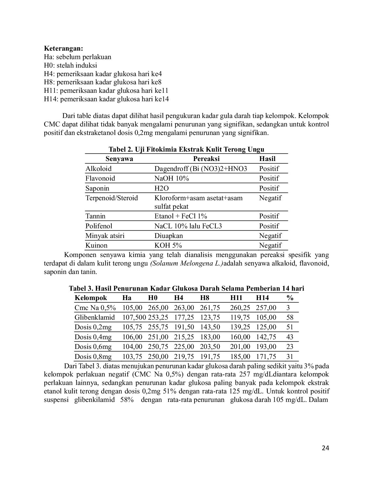 Penelitian ini menyimpulkan bahwa ekstrak etanol kulit terong ungu (Solanum Melongena L.) efektif menurunkan kadar gula darah pada mencit model diabetes.Hasil penelitian menunjukkan bahwa dosis 0,2 mg/kg berat badan memberikan penurunan kadar glukosa darah paling signifikan dibandingkan kelompok kontrol dan dosis lainnya.Oleh karena itu, ekstrak kulit terong ungu berpotensi sebagai agen antidiabetes alami.