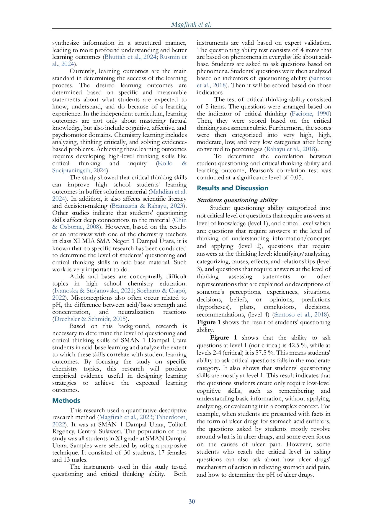 Jurnal Akademika KimiaJurnal Akademika KimiaAcid-base material is often considered difficult for students because it is abstract, leading to misconceptions and poor learning outcomes. The ability to ask questions reflects cognitive engagement and is closely related to the critical thinking required to understand abstract concepts. Therefore, it is important to examine this skill to obtain evidence of its role in improving chemistry learning outcomes and as a consideration for teachers in determining the appropriate learning process. This study aims to analyze students questioning skills and critical thinking abilities in acid-base learning and examine the relationship between these skills and students learning outcomes. A quantitative descriptive approach was employed and conducted at SMAN 1 Dampal Utara. The research subjects comprised 30 students, including 17 females and 13 males. The sample was selected using a purposive sampling technique. The instruments used for data collection included the questioning skills test and the critical thinking skills test. The results indicated that students questioning skills were categorized as moderate with a percentage of 57.5 %, similarly, their critical thinking abilities also fell into the mild category with a rate of 48.33 %. Correlation analysis revealed a significant relationship between questioning skills and learning outcomes (r= 0.386;α=0.035). Meanwhile, the relationship between critical thinking and learning outcomes was shown to be insignificant (r= 0.225;α= 0.173). These findings suggest that questioning skills can contribute to optimal learning outcomes.