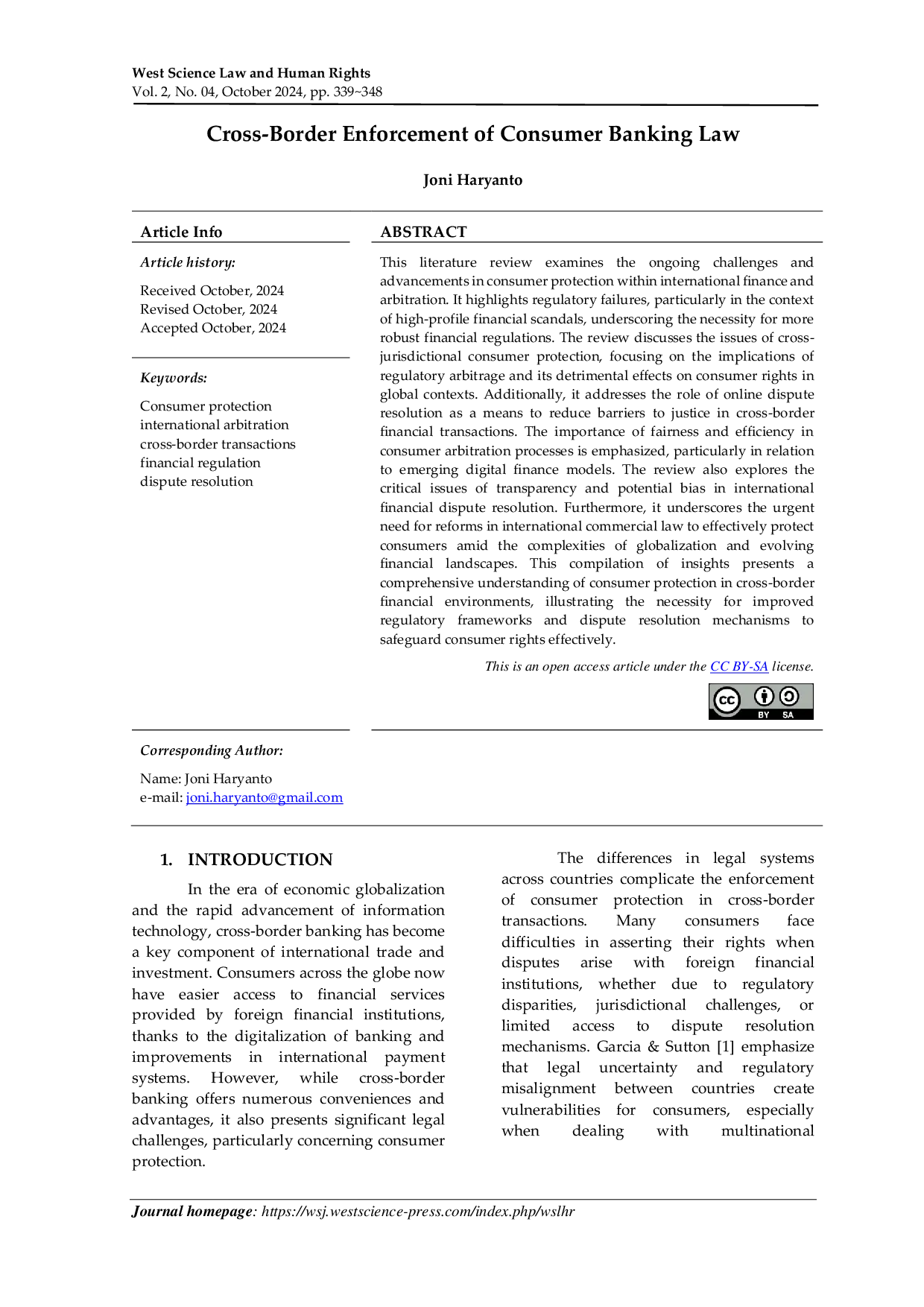 West Science Law and Human RightsWest Science Law and Human RightsTinjauan literatur ini menguji tantangan dan kemajuan yang berkelanjutan dalam perlindungan konsumen di bidang keuangan dan arbitrase internasional. Ini menyoroti kegagalan regulasi, terutama dalam konteks skandal keuangan tingkat tinggi, yang menggarisbawahi perlunya regulasi keuangan yang lebih kuat. Tinjauan ini membahas isu-isu perlindungan konsumen lintas yurisdiksi, berfokus pada implikasi arbitrase regulasi dan dampaknya yang merugikan terhadap hak-hak konsumen dalam konteks global. Selain itu, tinjauan ini membahas peran resolusi sengketa online sebagai sarana untuk mengurangi hambatan terhadap keadilan dalam transaksi keuangan lintas batas. Pentingnya keadilan dan efisiensi dalam proses arbitrase konsumen ditekankan, terutama dalam kaitannya dengan model keuangan digital yang berkembang. Tinjauan ini juga mengeksplorasi isu-isu kritis transparansi dan potensi bias dalam penyelesaian sengketa keuangan internasional. Selanjutnya, tinjauan ini menggarisbawahi kebutuhan mendesak untuk reformasi hukum komersial internasional guna secara efektif melindungi konsumen di tengah kompleksitas globalisasi dan lanskap keuangan yang berkembang. Kumpulan wawasan ini menyajikan pemahaman komprehensif tentang perlindungan konsumen dalam lingkungan keuangan lintas batas, yang menggambarkan perlunya kerangka regulasi dan mekanisme penyelesaian sengketa yang lebih baik untuk secara efektif menjaga hak-hak konsumen.