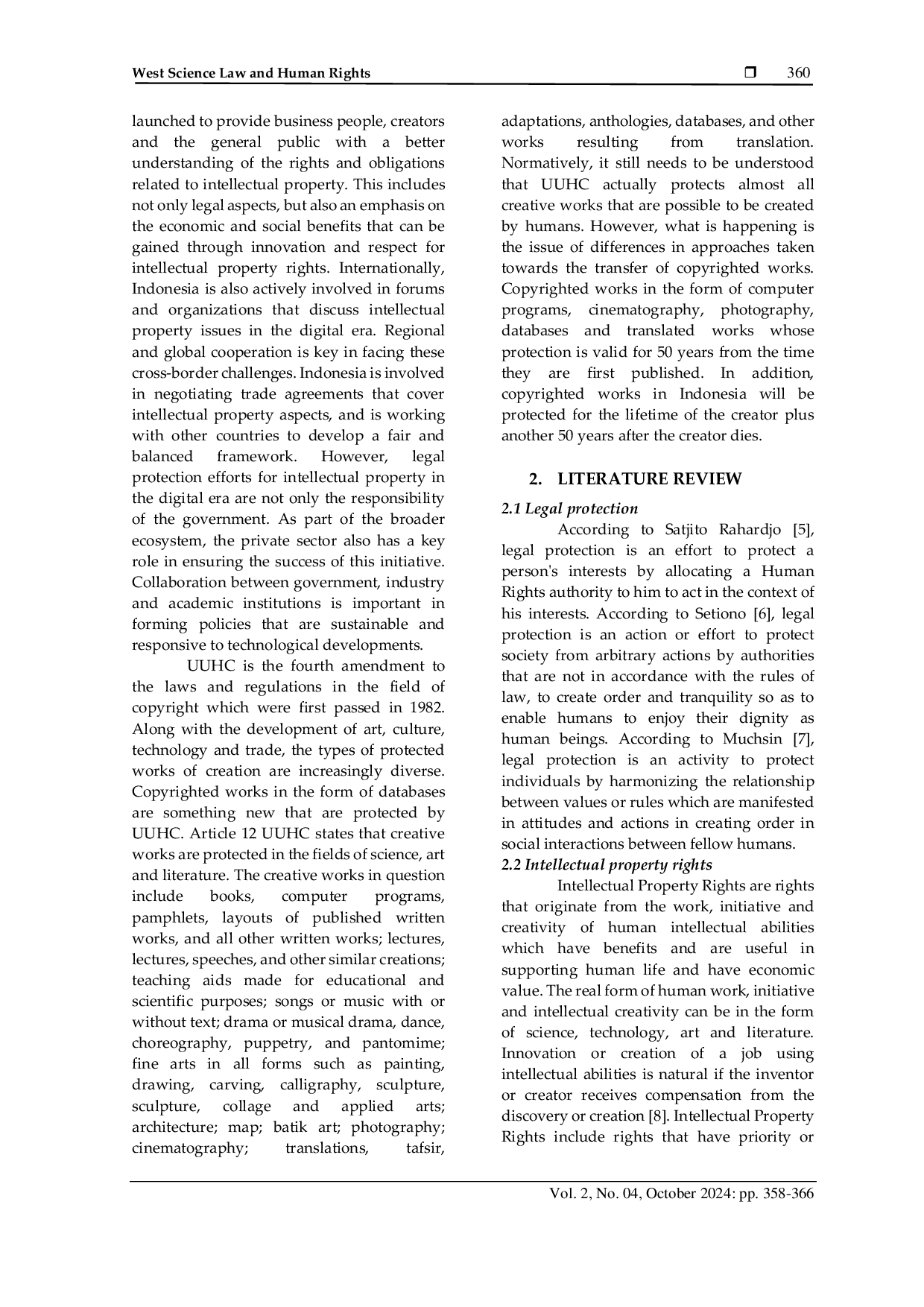 West Science Law and Human RightsWest Science Law and Human RightsThis research aims to understand the Legal Protection of Intellectual Property Rights in the Digital Industry: A Review of Legal Developments and Implementation Challenges. The literature study will also include a review of relevant legal literature, especially relating to intellectual property protection in the digital era. In addition, legal sources related to IPR in the digital era are also an important basis for this analysis, ensuring a deep understanding of the existing regulatory framework. By utilizing the latest literature and relevant legal sources, this research can provide a comprehensive understanding of the challenges, trends and solutions in protecting IPR amidst the dynamics of digital technology. Research results Legal protection of intellectual property rights (IPR) in the digital era is a complex and vital issue that requires a holistic approach. Challenges include copyright infringement, data security, and global competition for patents and trademarks. Strong and effective regulations are needed to address these challenges without stifling innovation and economic growth. Awareness of the importance of intellectual property rights must be increased through extensive educational campaigns and programs by increasing their understanding of copyright, patents, trademarks and industrial designs, individuals will play a greater role in respecting and protecting intellectual property rights in the digital era.
