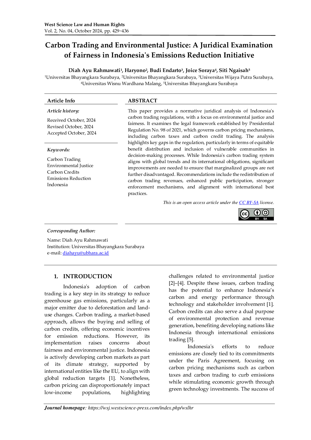 West Science Law and Human RightsWest Science Law and Human RightsThis paper provides a normative juridical analysis of Indonesias carbon trading regulations, with a focus on environmental justice and fairness. It examines the legal framework established by Presidential Regulation No. 98 of 2021, which governs carbon pricing mechanisms, including carbon taxes and carbon credit trading. The analysis highlights key gaps in the regulation, particularly in terms of equitable benefit distribution and inclusion of vulnerable communities in decision-making processes. While Indonesias carbon trading system aligns with global trends and its international obligations, significant improvements are needed to ensure that marginalized groups are not further disadvantaged. Recommendations include the redistribution of carbon trading revenues, enhanced public participation, stronger enforcement mechanisms, and alignment with international best practices.