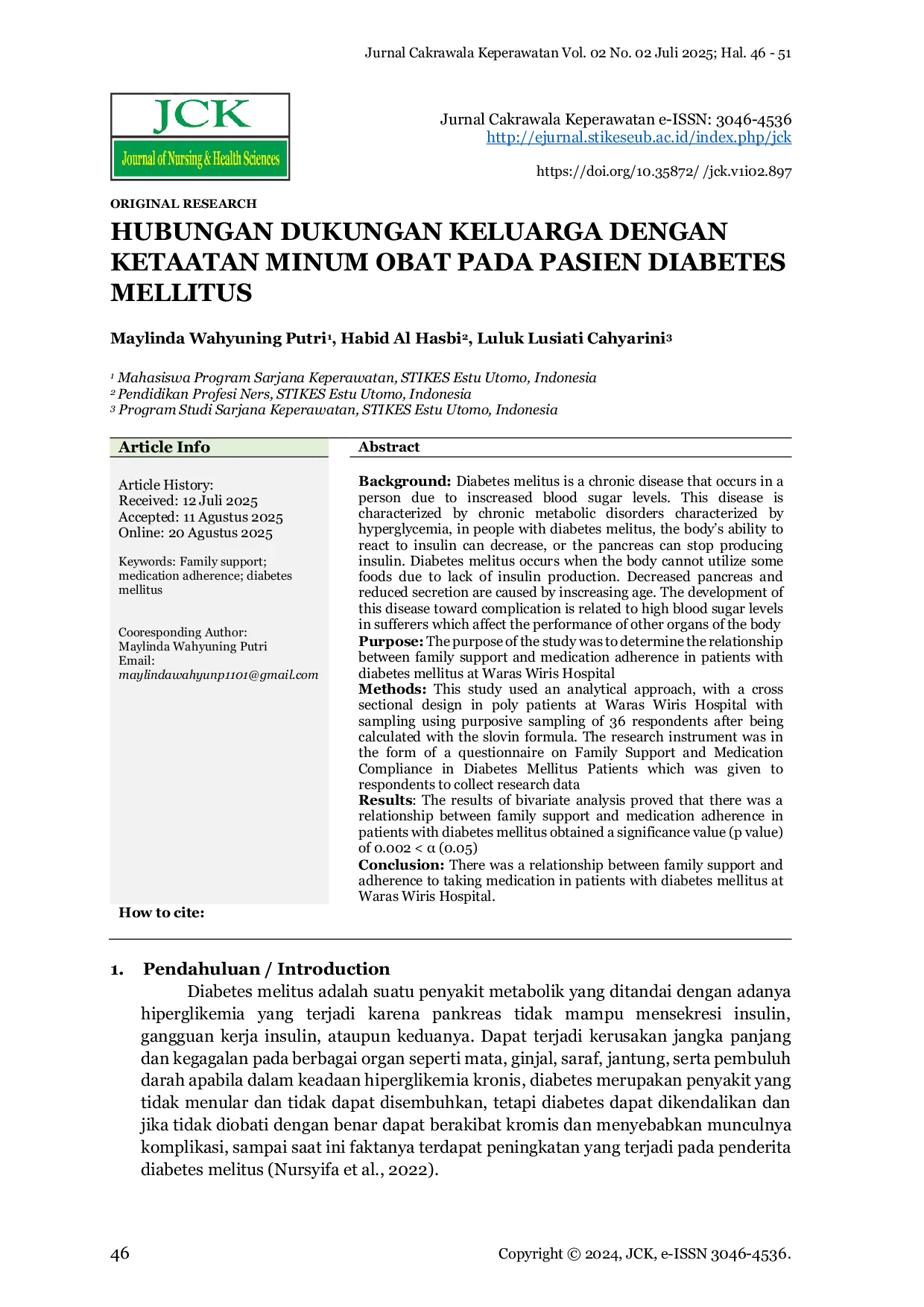 Jurnal Cakrawala KeperawatanJurnal Cakrawala KeperawatanDiabetes melitus adalah penyakit metabolik yang ditandai dengan hiperglikemia akibat pankreas tidak mampu mensekresi insulin atau gangguan kerja insulin. Penyakit ini dapat menyebabkan kerusakan jangka panjang pada berbagai organ. Tujuan penelitian ini adalah untuk menentukan hubungan antara dukungan keluarga dan ketaatan minum obat pada pasien diabetes mellitus di Rumah Sakit Waras Wiris. Penelitian ini menggunakan pendekatan analitik dengan desain cross sectional pada 36 responden yang dipilih menggunakan purposive sampling. Instrumen penelitian berupa kuesioner tentang dukungan keluarga dan ketaatan minum obat. Hasil analisis bivariat menunjukkan terdapat hubungan signifikan antara dukungan keluarga dan ketaatan minum obat (p = 0.002 < 0.05).