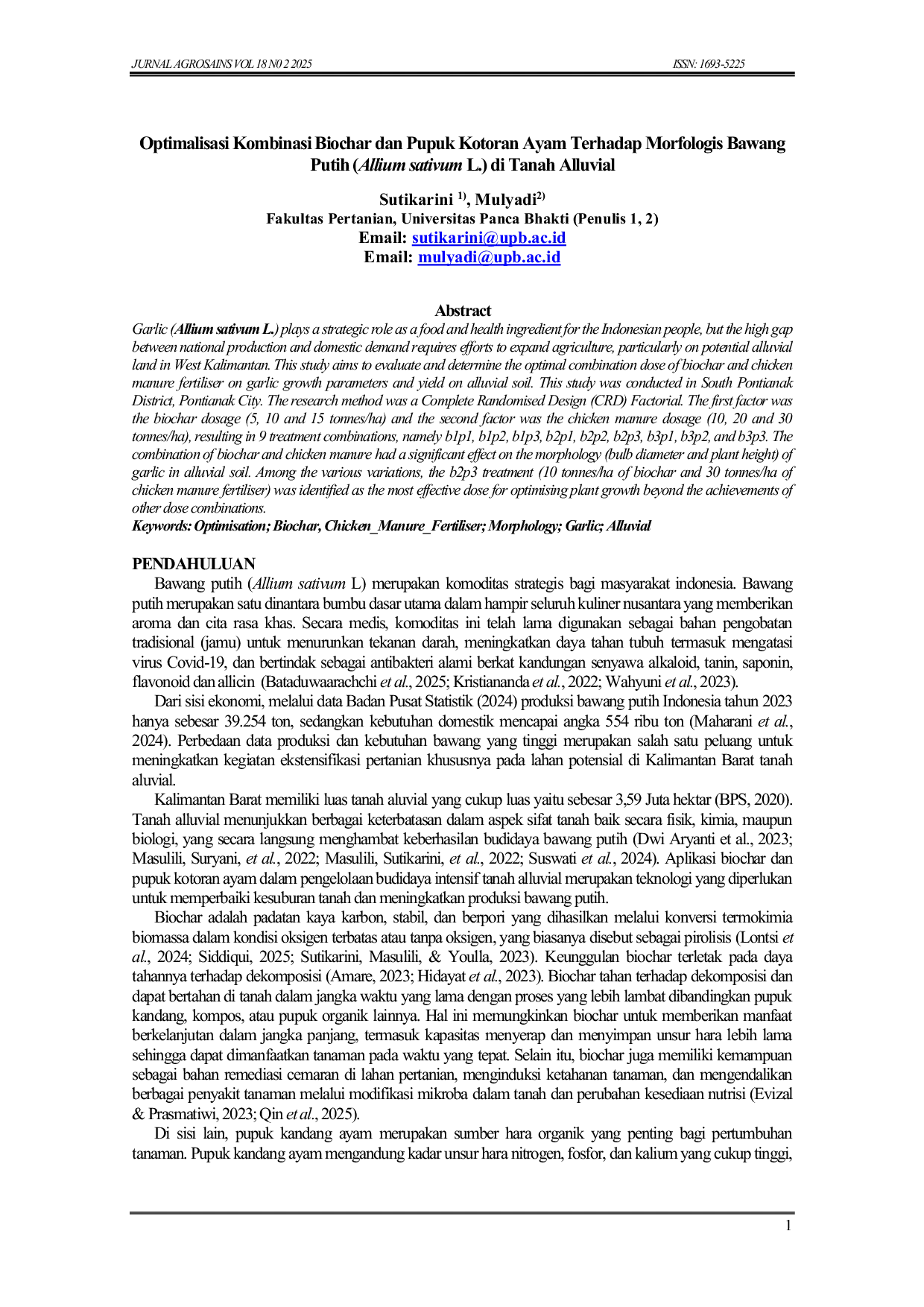 Jurnal Agrosains Universitas Panca BhaktiJurnal Agrosains Universitas Panca BhaktiBawang putih (Allium sativum L.) memegang peran strategis sebagai bahan pangan dan kesehatan bagi masyarakat Indonesia, namun kesenjangan tinggi antara produksi nasional dan permintaan domestik memerlukan upaya perluasan pertanian, khususnya pada lahan aluvial potensial di Kalimantan Barat. Penelitian ini bertujuan untuk mengevaluasi dan menentukan kombinasi dosis biochar dan pupuk kandang ayam yang optimal terhadap parameter pertumbuhan dan hasil bawang putih pada tanah aluvial. Penelitian ini dilakukan di Kecamatan Pontianak Selatan, Kota Pontianak. Metode penelitian yang digunakan adalah Rancangan Acak Lengkap (RAL) Faktorial. Faktor pertama adalah dosis biochar (5, 10 dan 15 ton/ha) dan faktor kedua adalah dosis pupuk kandang ayam (10, 20 dan 30 ton/ha), menghasilkan 9 kombinasi perlakuan. Kombinasi biochar dan pupuk kandang ayam berpengaruh signifikan terhadap morfologi (diameter umbi dan tinggi tanaman) bawang putih di tanah aluvial. Di antara berbagai variasi, perlakuan b2p3 (10 ton/ha biochar dan 30 ton/ha pupuk kandang ayam) diidentifikasi sebagai dosis paling efektif untuk mengoptimalkan pertumbuhan tanaman.