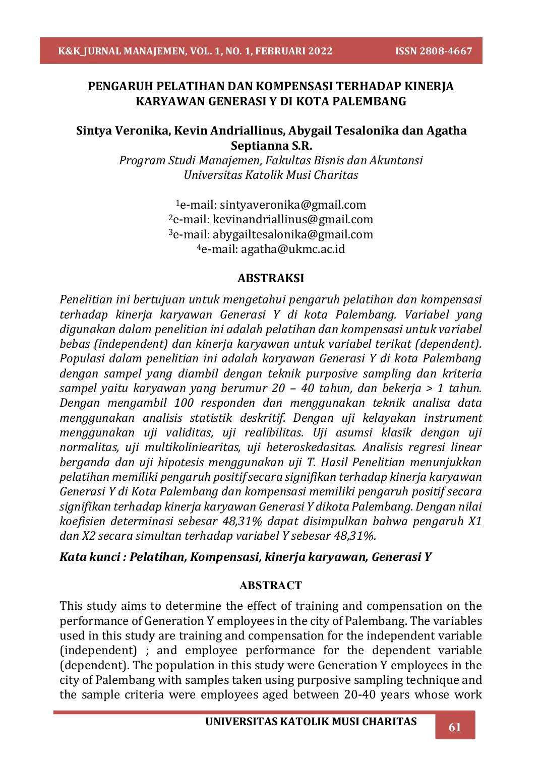 Konsumen & Konsumsi : Jurnal ManajemenKonsumen & Konsumsi : Jurnal ManajemenPenelitian ini bertujuan untuk mengetahui . Variabel yang digunakan dalam penelitian ini adalah pelatihan dan kompensasi untuk variabel bebas (independent) dan kinerja karyawan untuk variabel terikat (dependent). Populasi dalam penelitian ini adalah karyawan Generasi Y di kota Palembang dengan sampel yang diambil dengan teknik purposive sampling dan kriteria sampel yaitu karyawan yang berumur 20 - 40 tahun, dan bekerja > 1 tahun. Dengan mengambil 100 responden dan menggunakan teknik analisa data menggunakan analisis statistik deskritif. Dengan uji kelayakan instrument menggunakan uji validitas, uji realibilitas. Uji asumsi klasik dengan uji normalitas, uji multikoliniearitas, uji heteroskedasitas. Analisis regresi linear berganda dan uji hipotesis menggunakan uji T. Hasil Penelitian menunjukkan pelatihan memiliki pengaruh positif secara signifikan terhadap kinerja karyawan Generasi Y di Kota Palembang dan kompensasi memiliki pengaruh positif secara signifikan terhadap kinerja karyawan Generasi Y dikota Palembang. Dengan nilai koefisien determinasi sebesar 48,31% dapat disimpulkan bahwa pengaruh X1 dan X2 secara simultan terhadap variabel Y sebesar 48,31%.