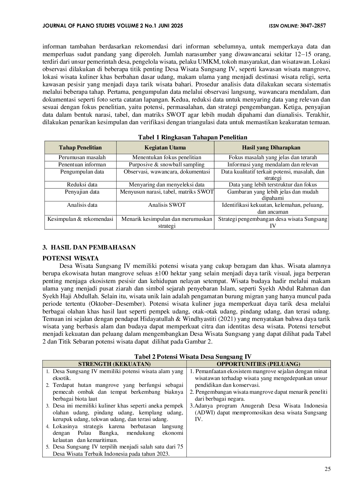 Journal Of Plano StudiesJournal Of Plano StudiesPembangunan desa wisata merupakan pendekatan pembangunan berbasis lokal yang bertujuan memperkuat identitas budaya, meningkatkan kesejahteraan masyarakat, dan mendorong daya saing wilayah. Penelitian ini mengkaji Desa Wisata Sungsang IV di Kecamatan Banyuasin II untuk mengidentifikasi potensi unggulan, permasalahan yang dihadapi, serta merumuskan strategi pengembangan yang tepat. Hasil penelitian menunjukkan bahwa Sungsang IV memiliki potensi wisata bahari, kuliner hasil laut khas, serta ekosistem mangrove yang masih alami dan menarik. Namun, pengembangan desa wisata ini juga menghadapi sejumlah kendala seperti keterbatasan infrastruktur pendukung, aksesibilitas yang cukup sulit, serta rendahnya kesadaran masyarakat terhadap pengelolaan wisata yang berkelanjutan. Strategi pengembangan yang disarankan meliputi peningkatan fasilitas dan sarana pendukung wisata, pemberdayaan masyarakat melalui pelatihan dan edukasi pariwisata, serta optimalisasi promosi dan pemasaran digital guna meningkatkan visibilitas destinasi.