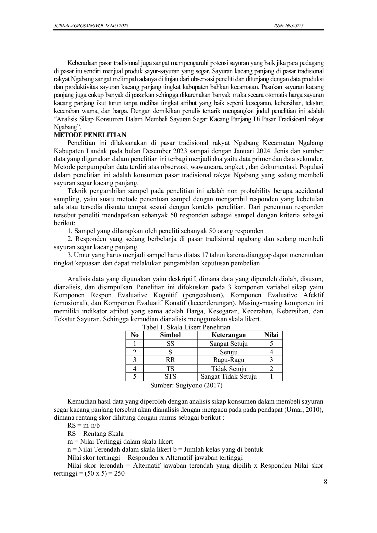Jurnal Agrosains Universitas Panca BhaktiJurnal Agrosains Universitas Panca BhaktiPenelitian ini bertujuan untuk menilai dan memastikan sikap konsumen dalam membeli sayuran segar kacang panjang di pasar tradisional Ngabang. Penelitian dilakukan pada Desember 2023 hingga Januari 2024, dengan menggunakan strategi sampling insidental, dan berhasil mengumpulkan 50 responden yang memenuhi kriteria penelitian. Responden dalam penelitian ini adalah konsumen yang membeli sayuran kacang panjang. Data yang dikumpulkan diolah, disusun, dianalisis, dan disimpulkan menggunakan metode analisis data deskriptif. Tiga variabel dalam penelitian ini adalah aspek kognitif, emosional, dan konatif dari sikap evaluatif. Ketiga variabel memiliki indikator yang sama, yaitu harga, tekstur sayuran, kebersihan, kecerahan, dan kesegaran. Data yang dikumpulkan dianalisis menggunakan skala Likert. Berdasarkan hasil penelitian, hampir semua responden memiliki sikap positif terhadap pembelian sayuran segar kacang panjang.