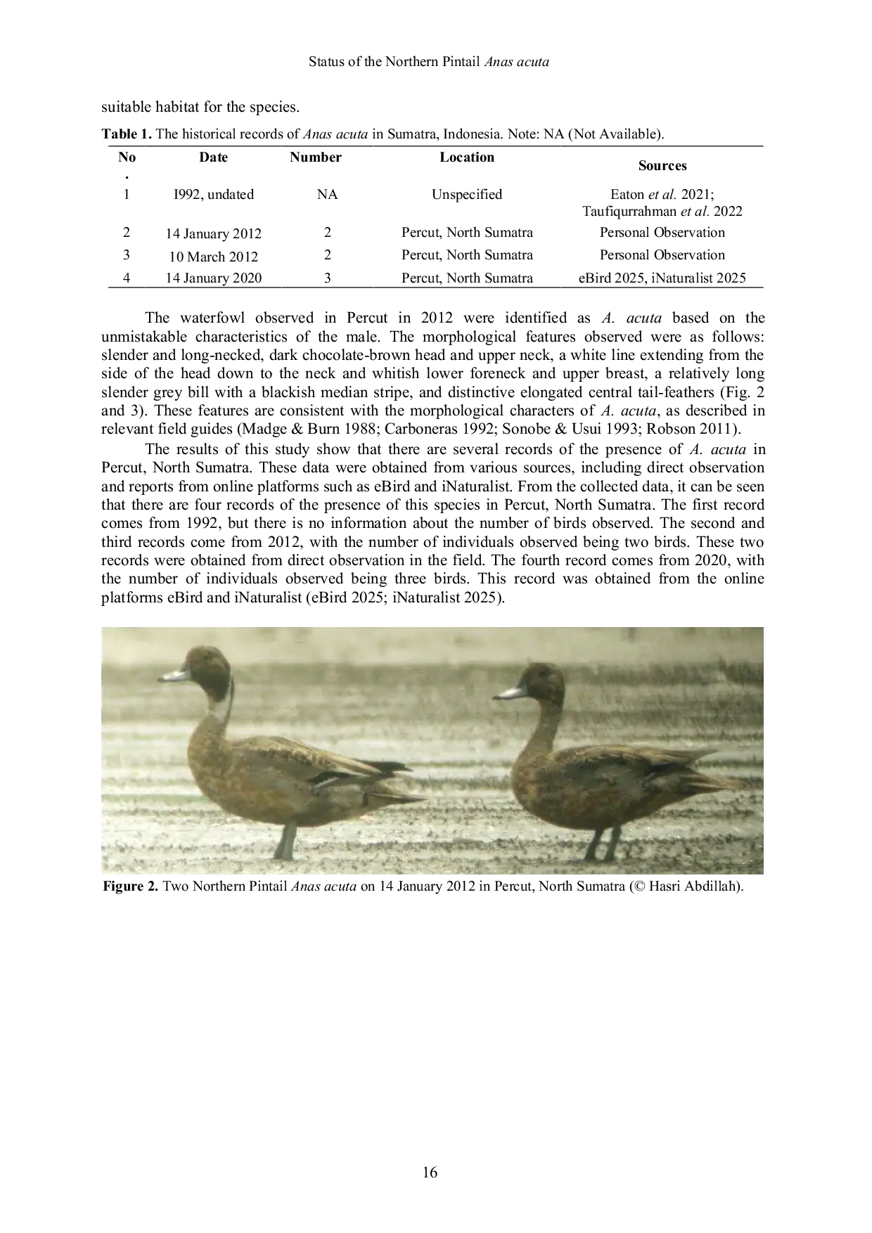 The study confirms the presence of the Northern Pintail (Anas acuta) in Sumatra, specifically with consistent records from Percut, North Sumatra, suggesting suitable habitat.This finding adds to the growing list of migratory waterbird records in the region, facilitated by increased local research and improved documentation capabilities.Further research is crucial to determine the species abundance and distribution in Sumatra to better understand its ecology and conservation status.