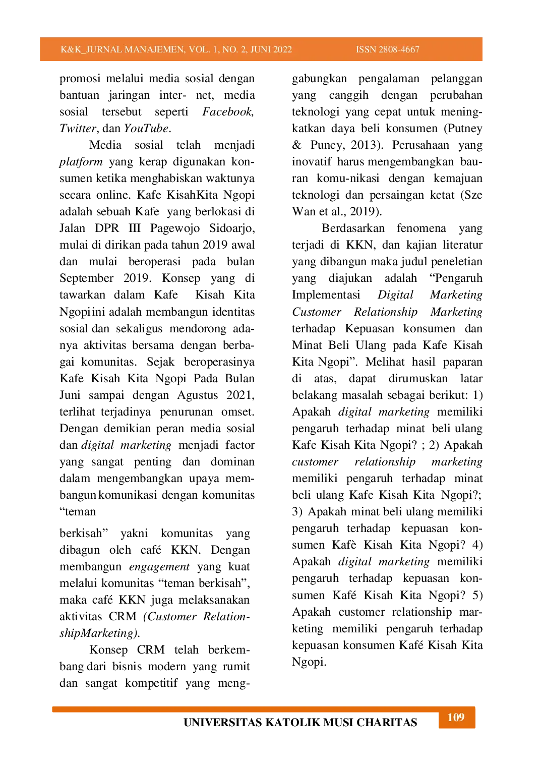 Konsumen & Konsumsi : Jurnal ManajemenKonsumen & Konsumsi : Jurnal ManajemenAbstrak: Salah satu pendekatan manajemen hubungan pelanggan dalam konteks pemasaran adalah pemasaran hubungan pelanggan (customer relationship marketing), dimana penerapannya didasarkan pada fenomena: (1) Penelusuran online pelanggan merupakan indikasi terbentuknya minat beli; dan (2) Pelanggan mengalokasikan waktu penelusuran online menggunakan media sosial dan situs web. Fenomena ini menjadi peluang bagi perusahaan untuk menarik konsumen baru, yakni dengan memahami pengaruh pemasaran digital (digital marketing) dan pemasaran hubungan pelanggan (customer relationship marketing) terhadap kepuasan dan minat beli ulang. Tujuan penelitian ini adalah: 1) Untuk mengetahui pengaruh digital marketing terhadap minat beli ulang; 2) Untuk mengetahui pengaruh customer relationship marketing terhadap minat beli ulang; 3) Untuk mengetahui pengaruh kepuasan terhadap minat beli ulang; 4) Untuk mengetahui pengaruh digital marketing terhadap kepuasan; 5) Untuk mengetahui pengaruh customer relationship marketing terhadap kepuasan. Subyek Penelitian adalah pelanggan Kafe Kisah Kita Ngopi di Sidoarjo - Surabaya. Uji hipotesis dilakukan dengan metode Structural Equation Modelling dengan menggunakan PLS. Hasil penelitian adalah: 1) Digital marketing tidak memiliki pengaruh terhadap minat beli ulang pelanggan Kafé Kisah Kita Ngopi; 2) Customer relationship marketing memiliki pengaruh terhadap minat beli ulang pelanggan Kafe Kisah Kita Ngopi; 3) Kepuasan berpengaruh terhadap minat beli ulang pelanggan Kafe Kisah Kita Ngopi; 4) Digital marketing tidak memiliki pengaruh terhadap kepuasan pelanggan Kafe Kisah Kita Ngopi; dan 5) Customer relationship marketing berpengaruh terhadap kepuasan pelanggan Kafe Kisah Kita Ngopi.