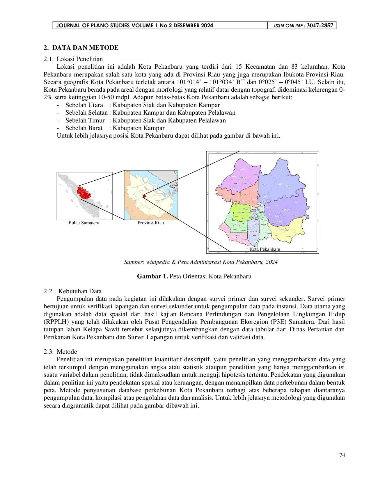 Journal Of Plano StudiesJournal Of Plano StudiesPerkebunan merupakan subsektor yang berperan penting dalam pembangunan sektor pertanian di Indonesia. Kota Pekanbaru adalah salah satu wilayah di Riau dan merupakan ibukota provinsi Riau yang memiliki lahan perkebunan. Belum tersedianya data spasial perkebunan Kota Pekanbaru perlu menjadi perhatian, mengingat visi Kota Pekanbaru menuju smart city madani. Perkembangan teknologi di bidang pemetaan, seperti Sistem Informasi Geografis, perlu dimanfaatkan dalam pemetaan perkebunan. Tujuan penelitian ini adalah agar tersedianya data spasial perkebunan kota Pekanbaru yang memiliki atribut dan sistem koordinat terkini dalam rangka mendukung visi Kota Pekanbaru Smart City Madani.