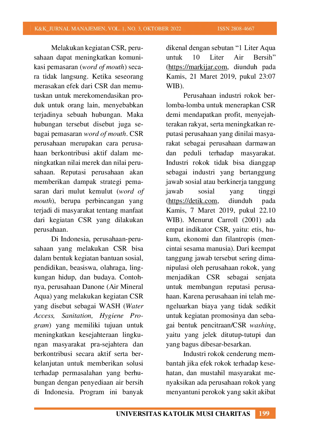 Konsumen & Konsumsi : Jurnal ManajemenKonsumen & Konsumsi : Jurnal ManajemenPerusahaan rokok melakukan CSR washing untuk menaikan reputasi perusahaan dan meningkatkan Word of Mouth. Kegiatan CSR ini tidak ada bedanya dengan kegiatan marketing atau promosi, karena perusahaan rokok tidak bisa dianggap sebagai industri yang bertanggung jawab sosial. Sehingga penelitian ini ingin melihat pengaruh kegiatan CSR perusahaan rokok terhadap Word of Mouth yang dimediasi Reputasi Perusahaan. Metode penelitian melalui penyebaran kuesioner. Adapun populasi dalam penelitian ini adalah orang dewasa yang merokok di kota Palembang dan sampelnya adalah beberapa cafe bersponsor rokok di Palembang. Pada penelitian ini mengumpulkan kuesioner sebanyak 112 responden. Teknik analisis yang digunakan adalah analisis jalur. Hasil penelitian yang didapat adalah Corporate Social Responsibility memiliki pengaruh terhadap Word of Mouth yang dimediasi oleh Corporate Reputation, sehingga hipotesis 4 diterima. Namun Corporate Social Responsibility tidak memiliki pengaruh langsung terhadap Word of Mouth, sehingga hipotesis 1 ditolak.