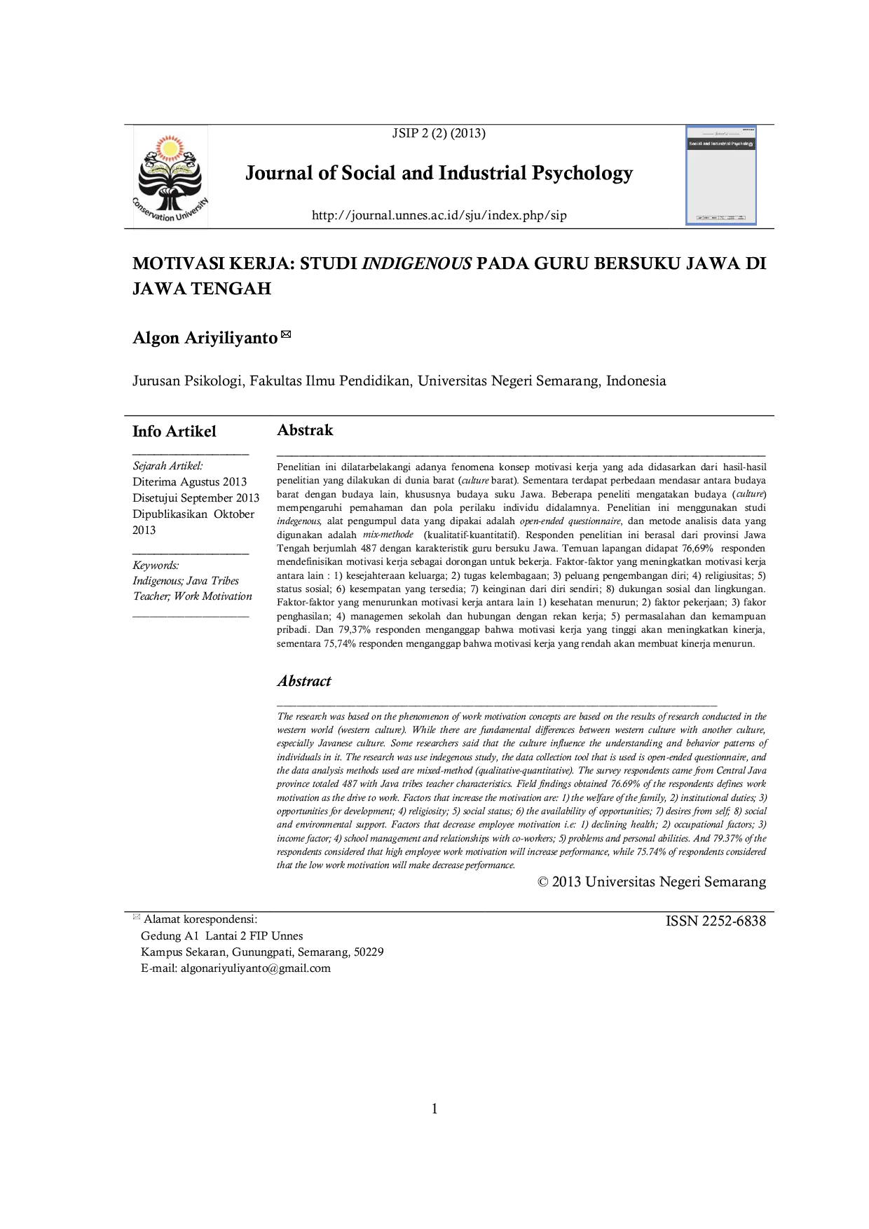 Journal of Social and Industrial PsychologyJournal of Social and Industrial PsychologyPenelitian ini dilatarbelakangi adanya fenomena konsep motivasi kerja yang ada didasarkan dari hasil-hasil penelitian yang dilakukan di dunia barat (culture barat). Sementara terdapat perbedaan mendasar antara budaya barat dengan budaya lain, khususnya budaya suku Jawa. Beberapa peneliti mengatakan budaya (culture) mempengaruhi pemahaman dan pola perilaku individu didalamnya. Penelitian ini menggunakan studi indegenous, alat pengumpul data yang dipakai adalah open-ended questionnaire, dan metode analisis data yang digunakan adalah mix-methode (kualitatif-kuantitatif). Responden penelitian ini berasal dari provinsi Jawa Tengah berjumlah 487 dengan karakteristik guru bersuku Jawa. Temuan lapangan didapat 76,69% responden mendefinisikan motivasi kerja sebagai dorongan untuk bekerja. Faktor-faktor yang meningkatkan motivasi kerja antara lain : 1) kesejahteraan keluarga; 2) tugas kelembagaan; 3) peluang pengembangan diri; 4) religiusitas; 5) status sosial; 6) kesempatan yang tersedia; 7) keinginan dari diri sendiri; 8) dukungan sosial dan lingkungan. Faktor-faktor yang menurunkan motivasi kerja antara lain 1) kesehatan menurun; 2) faktor pekerjaan; 3) fakor penghasilan; 4) managemen sekolah dan hubungan dengan rekan kerja; 5) permasalahan dan kemampuan pribadi. Dan 79,37% responden menganggap bahwa motivasi kerja yang tinggi akan meningkatkan kinerja, sementara 75,74% responden menganggap bahwa motivasi kerja yang rendah akan membuat kinerja menurun.