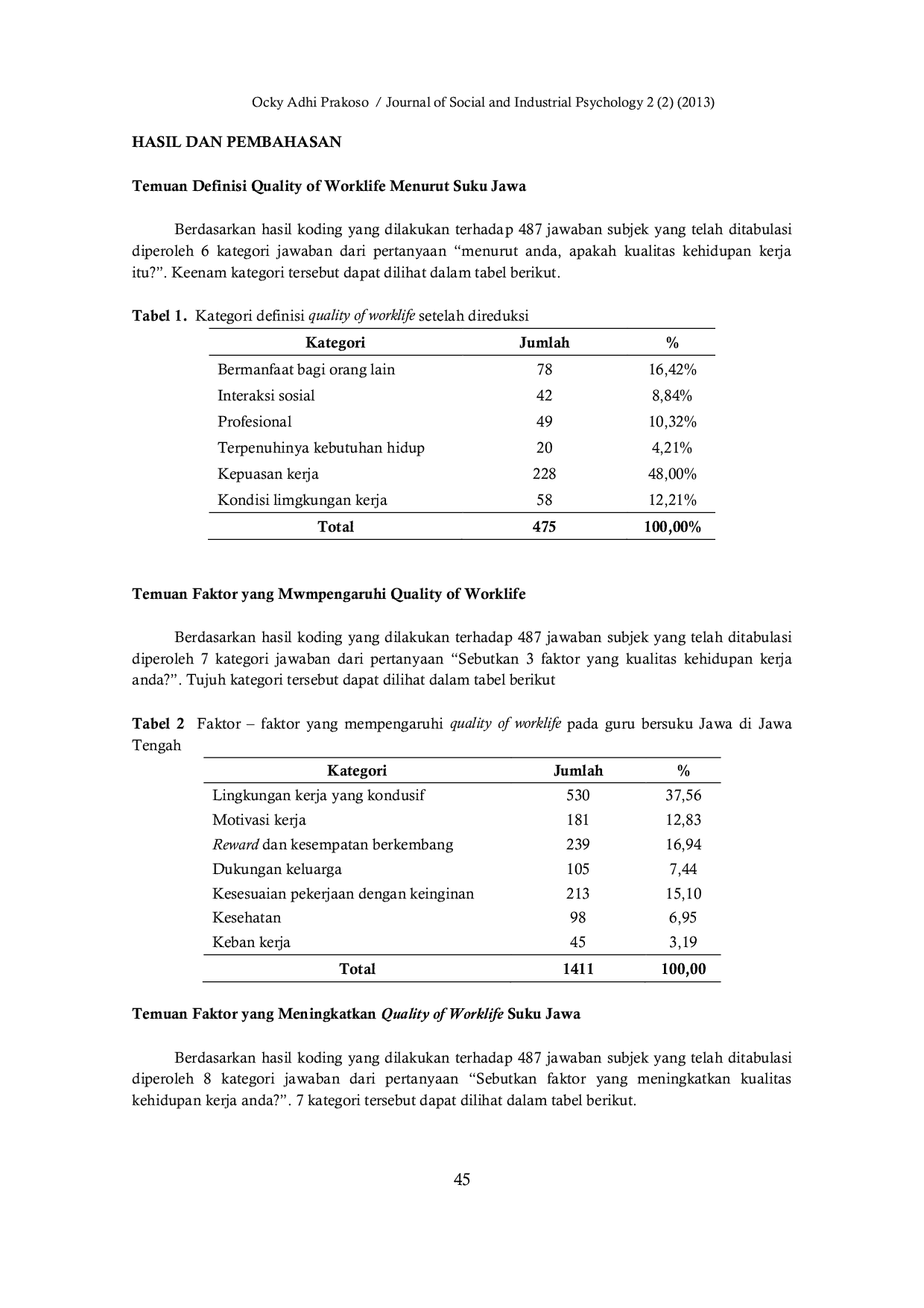 Journal of Social and Industrial PsychologyJournal of Social and Industrial PsychologyPenelitian ini dilatarbelakangi adanya fenomena konsep quality of worklife yang ada didasarkan dari hasil-hasil penelitian yang dilakukan di dunia barat (culture barat). Penelitian quality of worklife yang dilakukan di berbagai wilayah lain menggunakan konstruk teori quality of worklife yang disusun ahli-ahli dari dunia Barat. Sementara beberapa peneliti mengatakan budaya (culture) mempengaruhi pemahaman dan pola perilaku individu didalamnya. Selain itu juga terdapat perbedaan mendasar antara budaya barat dengan budaya lain, khususnya budaya suku Jawa. Dari fakta tersebut peneliti memperkirakan akan terjadi perbedaan antara konsep quality of worklife yang dimunculkan antara budaya barat dengan budaya Jawa. Tujuan dari studi ini adalah untuk mencari dan mengetahui tentang definisi quality of worklife serta faktor-faktor yang mempengaruhi quality of worklife pada guru bersuku jawa di Jawa tengah. Penelitian ini menggunakan studi indegenous yaitu suatu pendekatan yang menekankan pada studi terhadap perilaku dan cara berpikir seseorang dalam konteks budayanya. Alat pengumpul data yang dipakai adalah open-ended questionnaire, dan metode analisis data yang digunakan adalah mix-methode (kualitatif-kuantitatif). Responden penelitian ini berasal dari provinsi Jawa Tengah berjumlah 487 dengan karakteristik guru bersuku Jawa. Temuan lapangan didapat enam kategori yang menyusun definisi quality of worklife dimana dua diantaranya merupakan unsur baru yang ditemukan pada guru bersuku Jawa di Jawa Tengah yaitu interaksi sosial dan profesionalisme kerja. 12 faktor quality of worklife yang ditemukan pada guru bersuku jawa di Jawa tengah yaitu (1) lingkungan kerja yang kondusif (2) motivasi kerja (3) rewarddan kesempatan berkembang (4) dukungan keluarga (5) kesesuaian pekerjaan dan keinginan (6) kesehatan (7) beban kerja (8) kepuasan kerja (9) loyalitas kerja (10) gaji / kesejahteraan (11) kompetensi diri (12) kedisiplinan. Dua dari 12 (dua belas) faktor tersebut merupakan faktor baru yang ditemukan pada guru bersuku Jawa di Jawa Tengah yaitu kompetensi diri dan kedisiplinan.