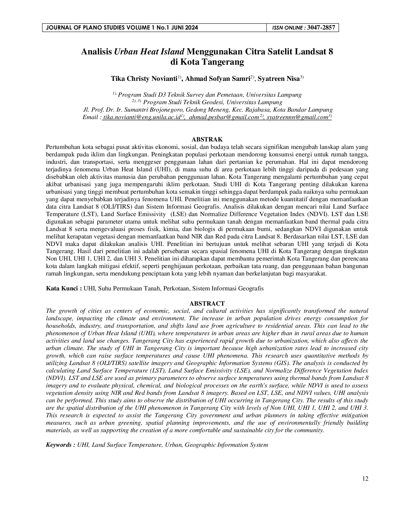Journal Of Plano StudiesJournal Of Plano StudiesPertumbuhan kota sebagai pusat aktivitas ekonomi, sosial, dan budaya telah secara signifikan mengubah lanskap alam yang berdampak pada iklim dan lingkungan. Peningkatan populasi perkotaan mendorong konsumsi energi untuk rumah tangga, industri, serta transportasi, serta menggeser penggunaan lahan dari pertanian ke perumahan. Hal ini dapat mendorong terjadinya fenomena Urban Heat Island (UHI), di mana suhu di area perkotaan lebih tinggi daripada di pedesaan yang disebabkan oleh aktivitas manusia dan perubahan penggunaan lahan. Kota Tangerang mengalami pertumbuhan yang cepat akibat urbanisasi yang juga mempengaruhi iklim perkotaan. Studi UHI di Kota Tangerang penting dilakukan karena urbanisasi yang tinggi membuat pertumbuhan kota semakin tinggi sehingga dapat berdampak pada naiknya suhu permukaan yang dapat menyebabkan terjadinya fenomena UHI. Penelitian ini menggunakan metode kuantitatif dengan memanfaatkan data citra Landsat 8 (OLI/TIRS) dan Sistem Informasi Geografis. Analisis dilakukan dengan mencari nilai Land Surface Temperature (LST), Land Surface Emissivity (LSE) dan Normalize Difference Vegetation Index (NDVI). LST dan LSE digunakan sebagai parameter utama untuk melihat suhu permukaan tanah dengan memanfaatkan band thermal pada citra Landsat 8 serta mengevaluasi proses fisik, kimia, dan biologis di permukaan bumi, sedangkan NDVI digunakan untuk melihat kerapatan vegetasi dengan memanfaatkan band NIR dan Red pada citra Landsat 8. Berdasarkan nilai LST, LSE dan NDVI maka dapat dilakukan analisis UHI. Penelitian ini bertujuan untuk melihat sebaran UHI yang terjadi di Kota Tangerang. Hasil dari penelitian ini adalah persebaran secara spasial fenomena UHI di Kota Tangerang dengan tingkatan Non UHI, UHI 1, UHI 2, dan UHI 3. Penelitian ini diharapkan dapat membantu pemerintah Kota Tangerang dan perencana kota dalam langkah mitigasi efektif, seperti penghijauan perkotaan, perbaikan tata ruang, dan penggunaan bahan bangunan ramah lingkungan, serta mendukung penciptaan kota yang lebih nyaman dan berkelanjutan bagi masyarakat.