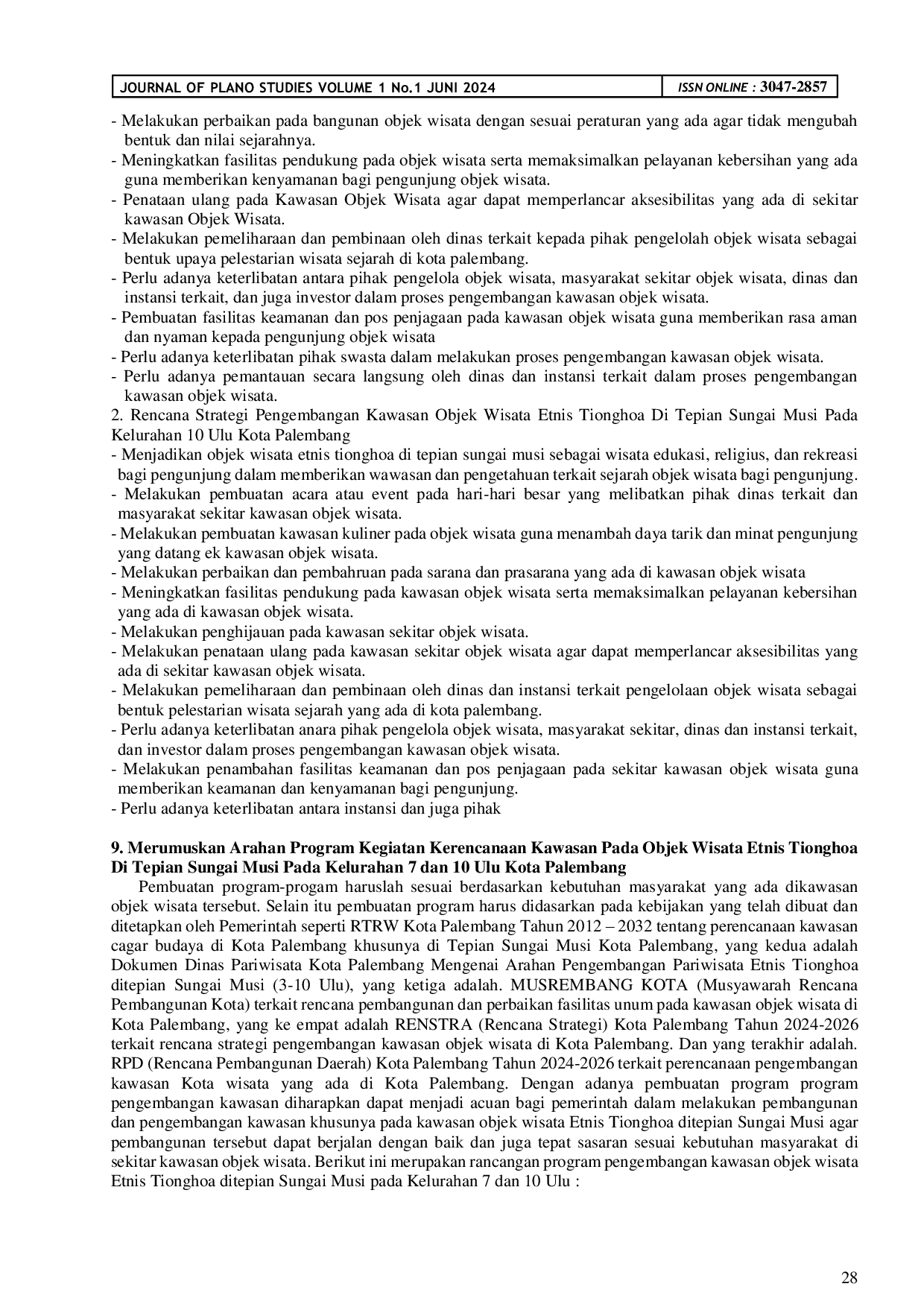 Journal Of Plano StudiesJournal Of Plano StudiesKota Palembang memiliki potensi wisata di tepian Sungai Musi, termasuk kawasan Kelurahan 7 dan 10 Ulu yang memiliki objek wisata sejarah terkait Kerajaan Cina. Penelitian ini bertujuan merumuskan strategi pengembangan kawasan objek wisata etnis Tionghoa di tepian Sungai Musi, dengan menggunakan metode analisis kualitatif dan pendekatan fenomenologi. Hasil analisis menunjukkan bahwa kedua kawasan memiliki karakteristik serupa, potensi, dan masalah yang dapat dikembangkan melalui perumusan strategi pengembangan. Tujuan penelitian adalah merumuskan arahan program kegiatan perencanaan kawasan objek wisata etnis Tionghoa di tepian Sungai Musi.