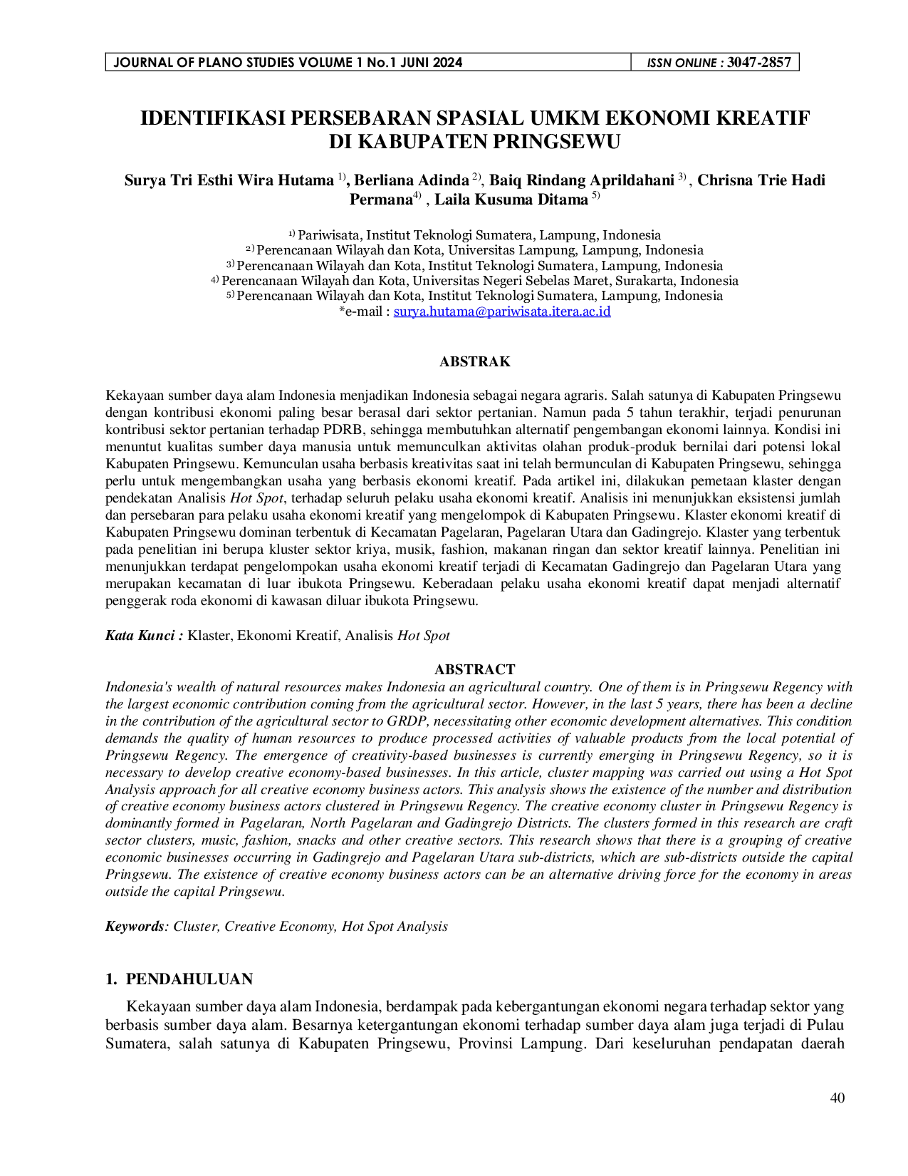 Journal Of Plano StudiesJournal Of Plano StudiesKekayaan sumber daya alam Indonesia menjadikan Indonesia sebagai negara agraris. Salah satunya di Kabupaten Pringsewu dengan kontribusi ekonomi paling besar berasal dari sektor pertanian. Namun pada 5 tahun terakhir, terjadi penurunan kontribusi sektor pertanian terhadap PDRB, sehingga membutuhkan alternatif pengembangan ekonomi lainnya. Kondisi ini menuntut kualitas sumber daya manusia untuk memunculkan aktivitas olahan produk-produk bernilai dari potensi lokal Kabupaten Pringsewu. Kemunculan usaha berbasis kreativitas saat ini telah bermunculan di Kabupaten Pringsewu, sehingga perlu untuk mengembangkan usaha yang berbasis ekonomi kreatif. Pada artikel ini, dilakukan pemetaan klaster dengan pendekatan Analisis Hot Spot, terhadap seluruh pelaku usaha ekonomi kreatif. Analisis ini menunjukkan eksistensi jumlah dan persebaran para pelaku usaha ekonomi kreatif yang mengelompok di Kabupaten Pringsewu. Klaster ekonomi kreatif di Kabupaten Pringsewu dominan terbentuk di Kecamatan Pagelaran, Pagelaran Utara dan Gadingrejo. Klaster yang terbentuk pada penelitian ini berupa kluster sektor kriya, musik, fashion, makanan ringan dan sektor kreatif lainnya. Penelitian ini menunjukkan terdapat pengelompokan usaha ekonomi kreatif terjadi di Kecamatan Gadingrejo dan Pagelaran Utara yang merupakan kecamatan di luar ibukota Pringsewu. Keberadaan pelaku usaha ekonomi kreatif dapat menjadi alternatif penggerak roda ekonomi di kawasan diluar ibukota Pringsewu.