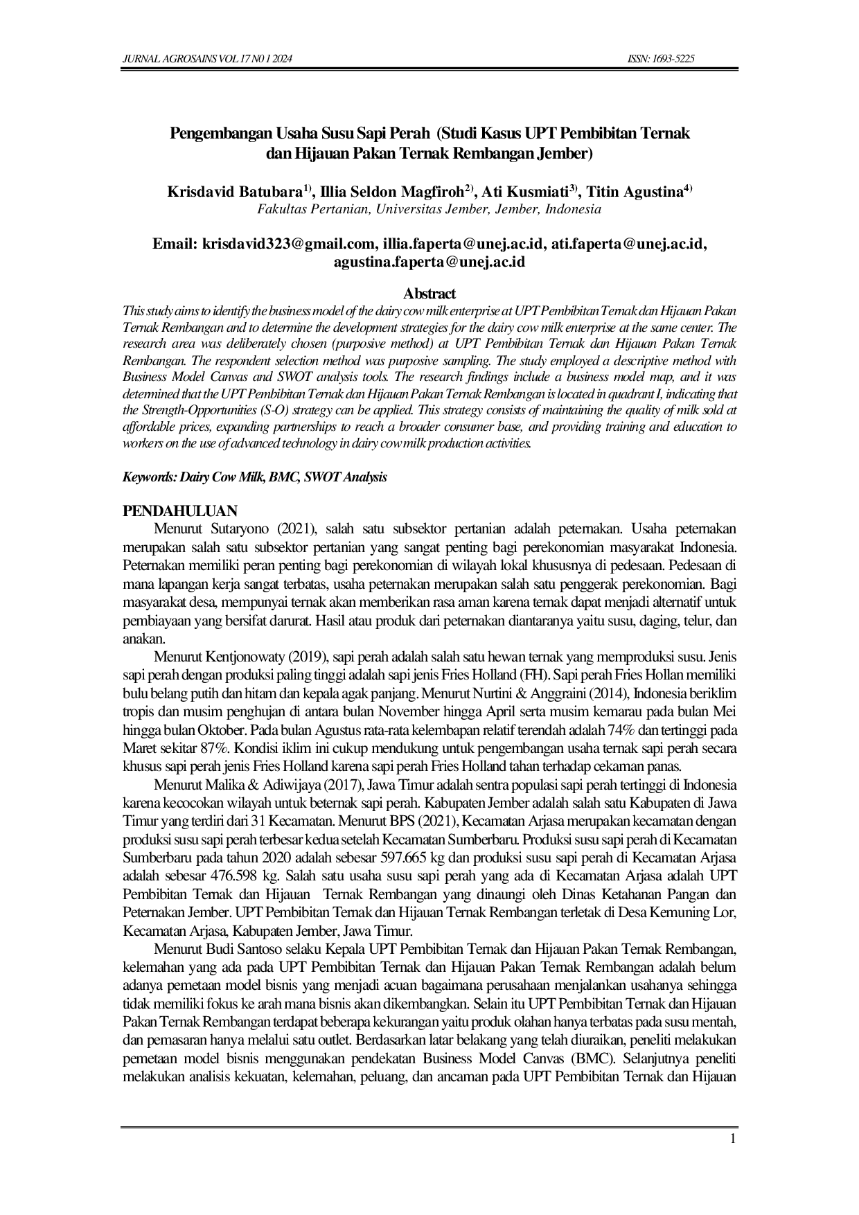 Jurnal Agrosains Universitas Panca BhaktiJurnal Agrosains Universitas Panca BhaktiPenelitian ini bertujuan untuk mengidentifikasi model bisnis usaha susu sapi perah di UPT Pembibitan Ternak dan Hijauan Pakan Ternak Rembangan serta menentukan strategi pengembangan untuk usaha tersebut. Area penelitian dipilih secara sengaja (metode purposif) di UPT Pembibitan Ternak dan Hijauan Pakan Ternak Rembangan. Pemilihan responden menggunakan metode purposive sampling. Penelitian ini menggunakan metode deskriptif dengan alat analisis Business Model Canvas dan SWOT. Hasil penelitian meliputi peta model bisnis, dan ditentukan bahwa UPT Pembibitan Ternak dan Hijauan Pakan Ternak Rembangan berada di kuadran I, yang mengindikasikan bahwa strategi Strength-Opportunities (S-O) dapat diterapkan. Strategi ini terdiri dari mempertahankan kualitas susu yang dijual dengan harga terjangkau, memperluas kemitraan untuk menjangkau basis konsumen yang lebih luas, dan memberikan pelatihan dan pendidikan kepada pekerja tentang penggunaan teknologi canggih dalam kegiatan produksi susu sapi perah.