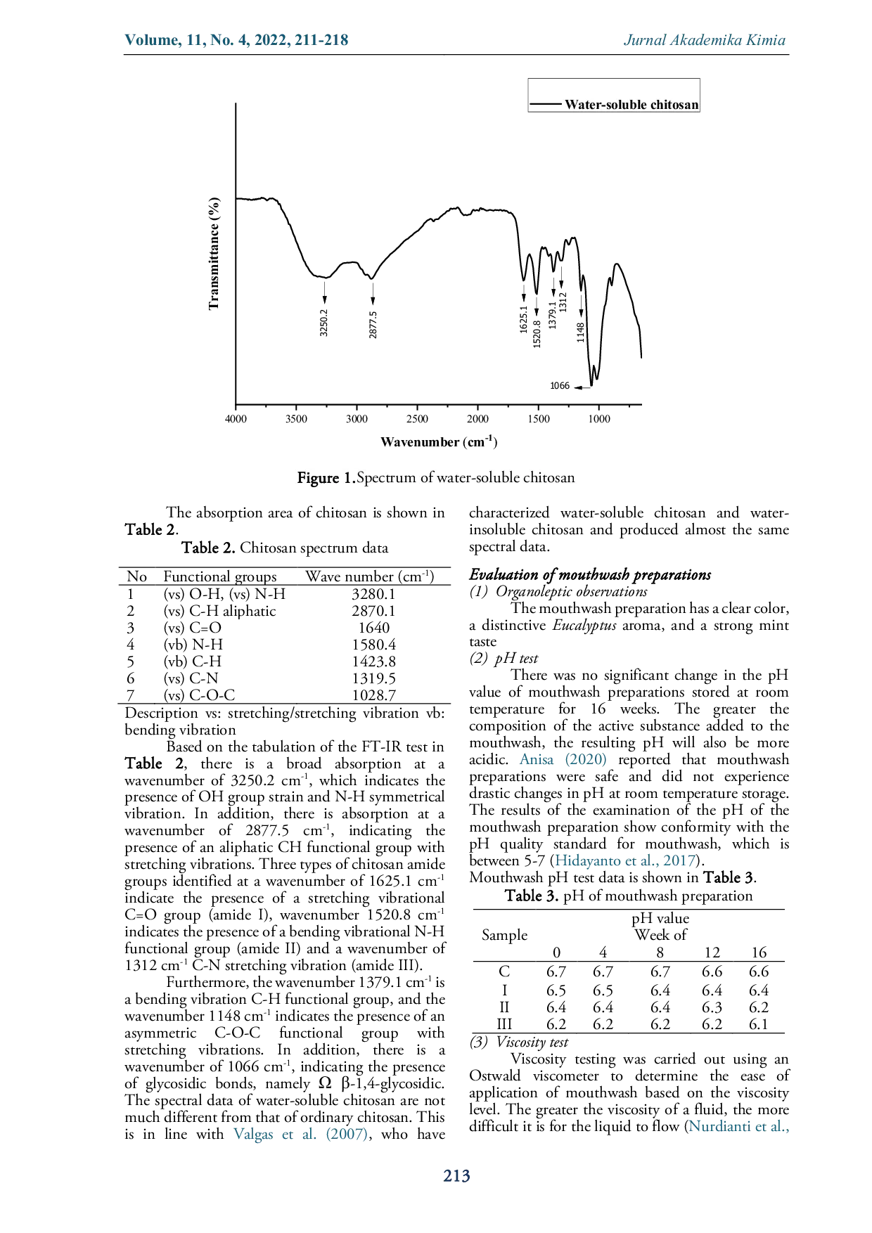 Jurnal Akademika KimiaJurnal Akademika KimiaDental and oral health problems are one of the problems that need attention. The oral cavity is colonized by various microflora and some bacteria, so it is necessary to develop additional oral cleaning methods besides brushing teeth. Mouthwash with natural ingredients, such as a combination of chitosan and Eucalyptus grandis, is the right choice. Chitosan is a type of water-soluble chitosan characterized using FT-IR. Meanwhile, Eucalyptus grandis was isolated using the Stahl method to obtain its essential oil. Mouthwash was evaluated through organoleptic testing, pH, viscosity, and antimicrobial testing. The most optimal formula is formula III, with an inhibition zone diameter of 11.9 ± 1.5 mm for Streptococcus mutans bacteria, 12.8 ± 0.9 mm for Staphylococcus aureus, and 12.2 ± 0.15 mm for Candida albicans.