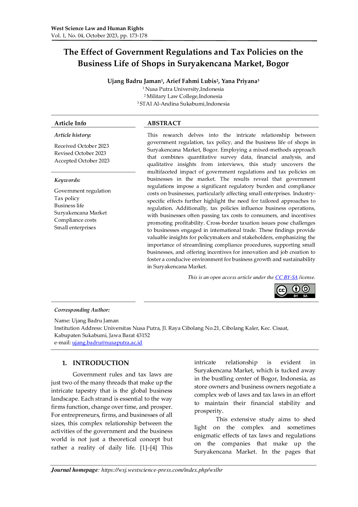 West Science Law and Human RightsWest Science Law and Human RightsPenelitian ini mengkaji hubungan kompleks antara regulasi pemerintah, kebijakan perpajakan, dan kehidupan bisnis toko di Pasar Suryakencana, Bogor. Menggunakan pendekatan metode campuran yang menggabungkan data survei kuantitatif, analisis keuangan, dan wawancara kualitatif, studi ini mengungkap dampak multifaset dari regulasi dan kebijakan perpajakan terhadap pelaku usaha di pasar. Hasil menunjukkan bahwa regulasi pemerintah memberikan beban administratif dan biaya kepatuhan yang signifikan, terutama bagi usaha kecil. Dampak sektoral khusus juga menekankan perlunya pendekatan regulasi yang disesuaikan. Selain itu, kebijakan perpajakan memengaruhi operasi bisnis, dengan pelaku usaha sering meneruskan beban pajak kepada konsumen, sementara insentif pajak mendorong profitabilitas. Isu perpajakan lintas batas menimbulkan tantangan bagi usaha yang terlibat dalam perdagangan internasional. Temuan ini memberikan wawasan penting bagi pembuat kebijakan dan pemangku kepentingan, menekankan perlunya penyederhanaan prosedur kepatuhan, dukungan bagi usaha kecil, serta pemberian insentif untuk inovasi dan penciptaan lapangan kerja guna menciptakan lingkungan yang kondusif bagi pertumbuhan dan keberlanjutan bisnis di Pasar Suryakencana.