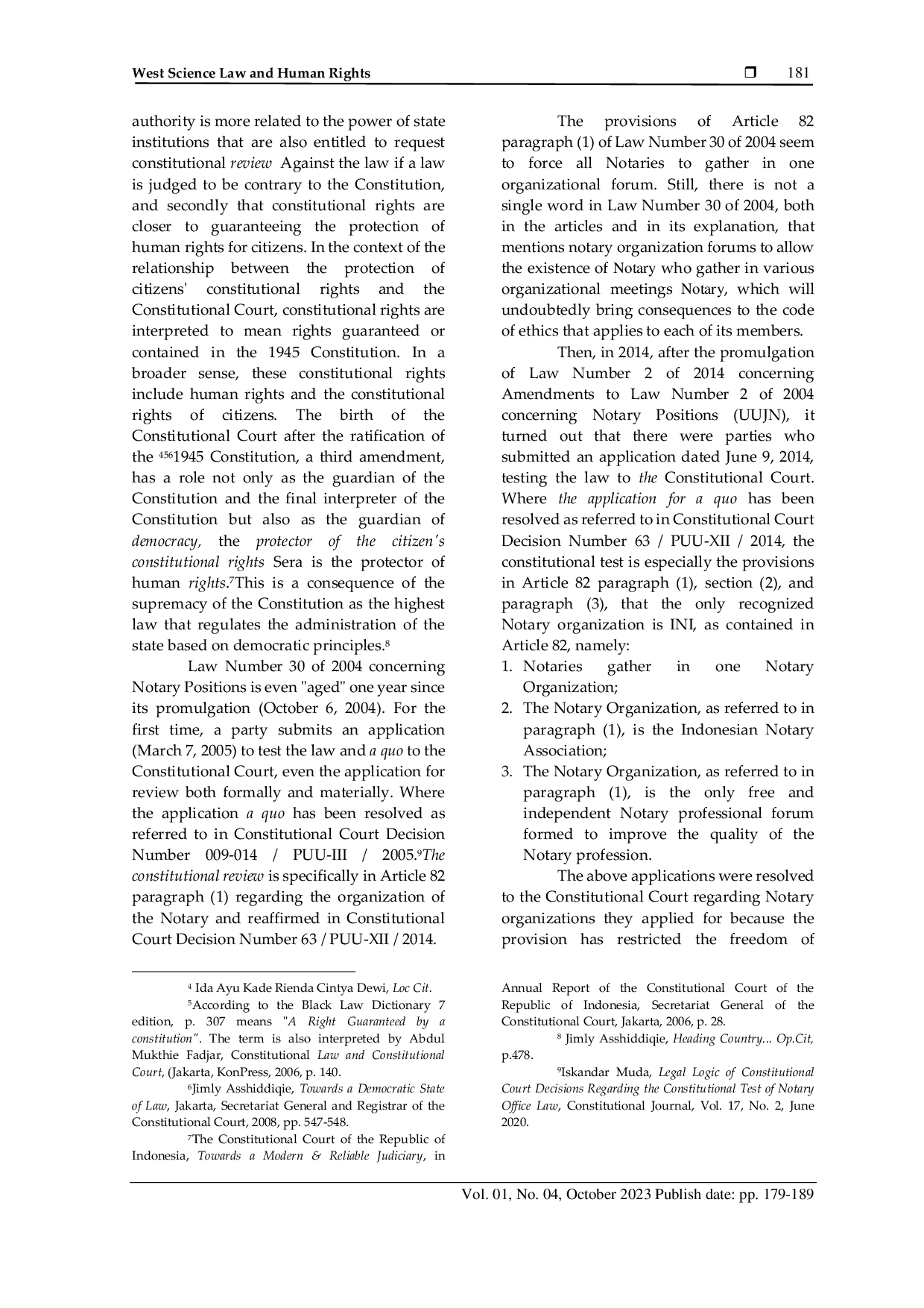 West Science Law and Human RightsWest Science Law and Human RightsPenelitian ini didorong oleh Uji Undang-Undang ke Mahkamah Konstitusi, yaitu uji Undang-Undang Jabatan Notaris (UUJN), khususnya Pasal 82 mengenai Organisasi Notaris, para pemohon meminta uji quo karena ketentuan tersebut telah membatasi kebebasan berserikat bagi Notaris untuk membentuk organisasi profesi Notaris. Pembatasan ini dianggap telah melanggar hak asasi manusia Notaris, terutama hak untuk berserikat, berkumpul, dan menyampaikan pendapat sebagaimana jaminan konstitusional yang tercantum dalam Undang-Undang Dasar Republik Indonesia Tahun 1945 (UUD 1945), Keberadaan Ikatan Notaris Indonesia (INI) sebagai satu-satunya organisasi profesi Notaris semakin diperkuat setelah melewati uji konstitusional di Mahkamah Konstitusi. Hakim Konstitusi dalam Putusan Mahkamah Konstitusi Nomor 009-014/PUU-III/2005 dan ditegaskan kembali dalam Putusan Mahkamah Konstitusi Nomor 63/PUU-XII/2014 bahwa Putusan Mahkamah Konstitusi adalah organisasi Ikatan Notaris Indonesia yang diakui keberadaannya, tetapi juga bahwa putusannya yang membubarkan organisasi selain Ikatan Notaris Indonesia, sehingga keberadaan INI sebagai satu-satunya organisasi tunggal notaris yang diatur dalam UUJN tidak bertentangan dengan UUD 1945. Alih-alih terkesan sebagai upaya mengabaikan nilai Hak Asasi Manusia (HAM), Kebebasan dalam organisasi notaris hanya didasarkan pada kebebasan etis yang mengacu pada baik atau buruknya suatu tindakan yang diukur dari sejauh mana tindakan tersebut memberikan perlindungan terhadap kebebasan dan perluasan kemampuan, yang dalam hal ini adalah kemampuan dalam menjalankan profesinya sebagai Notaris dan Wadah Tunggal adalah suatu keharusan.