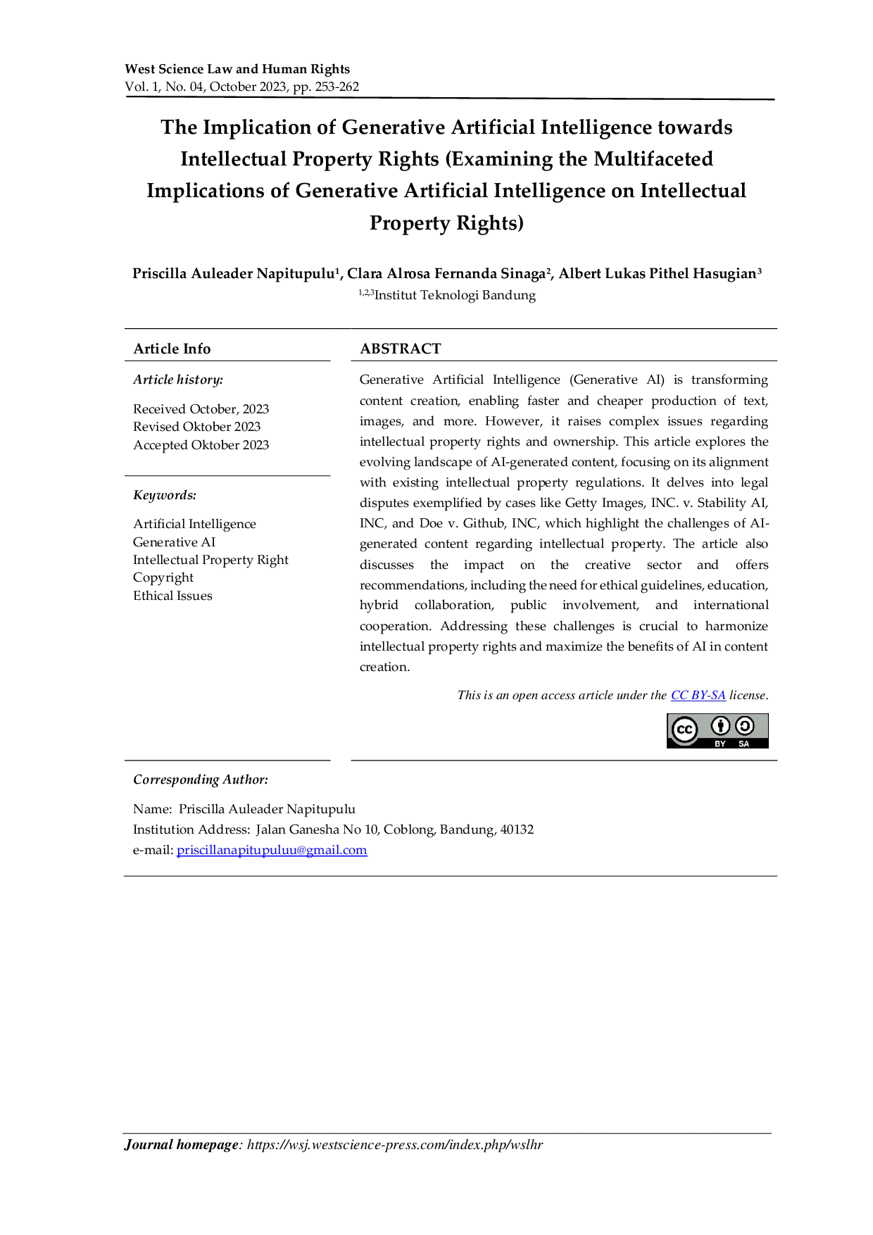 West Science Law and Human RightsWest Science Law and Human RightsKecerdasan Buatan Generatif (Kecerdasan Buatan Generatif) sedang mengubah penciptaan konten, memungkinkan produksi teks, gambar, dan lainnya yang lebih cepat dan murah. Namun, hal ini menimbulkan masalah kompleks terkait hak kekayaan intelektual dan kepemilikan. Artikel ini menyelidiki lanskap yang berkembang dari konten yang dihasilkan AI, dengan fokus pada kesesuaiannya dengan regulasi kekayaan intelektual yang ada. Artikel ini membahas sengketa hukum yang ditunjukkan oleh kasus seperti Getty Images, INC. v. Stability AI, INC, dan Doe v. Github, INC, yang menyoroti tantangan konten yang dihasilkan AI terkait kekayaan intelektual. Artikel ini juga membahas dampak terhadap sektor kreatif dan menawarkan rekomendasi, termasuk kebutuhan pedoman etika, pendidikan, kolaborasi hibrida, keterlibatan publik, dan kerjasama internasional. Menangani tantangan ini penting untuk menyelaraskan hak kekayaan intelektual dan memaksimalkan manfaat AI dalam penciptaan konten.