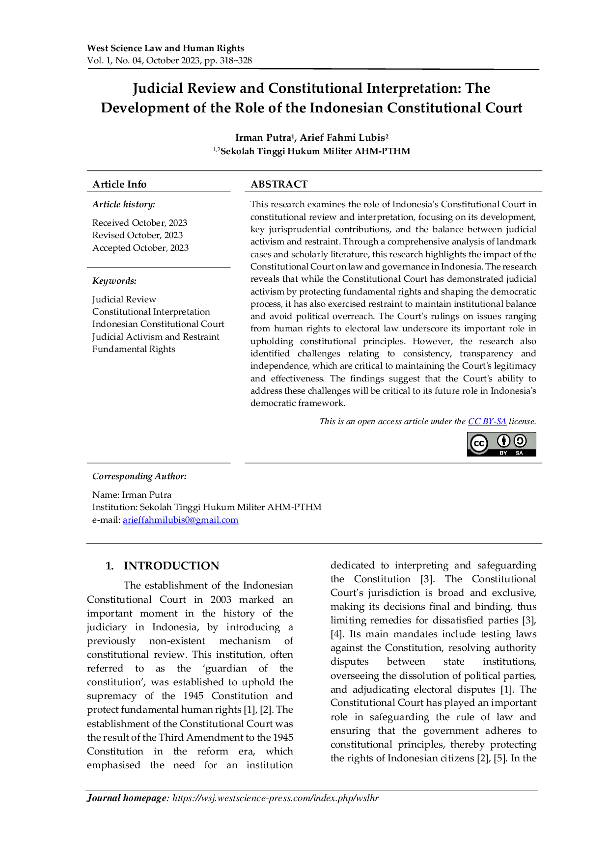 West Science Law and Human RightsWest Science Law and Human RightsThis research examines the role of Indonesias Constitutional Court in constitutional review and interpretation, focusing on its development, key jurisprudential contributions, and the balance between judicial activism and restraint. Through a comprehensive analysis of landmark cases and scholarly literature, this research highlights the impact of the Constitutional Court on law and governance in Indonesia. The research reveals that while the Constitutional Court has demonstrated judicial activism by protecting fundamental rights and shaping the democratic process, it has also exercised restraint to maintain institutional balance and avoid political overreach. The Courts rulings on issues ranging from human rights to electoral law underscore its important role in upholding constitutional principles. However, the research also identified challenges relating to consistency, transparency and independence, which are critical to maintaining the Courts legitimacy and effectiveness. The findings suggest that the Courts ability to address these challenges will be critical to its future role in Indonesias democratic framework.