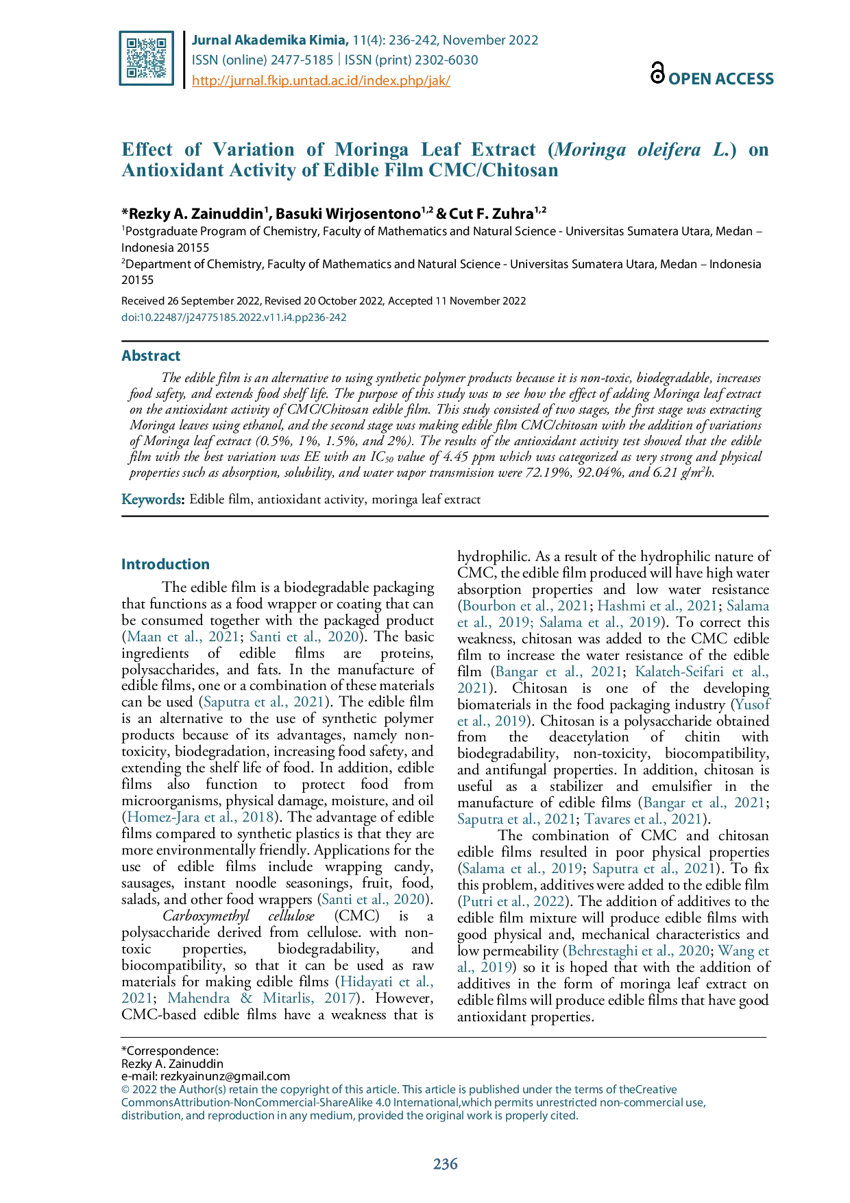 Jurnal Akademika KimiaJurnal Akademika KimiaFilm makanan adalah alternatif penggunaan produk polimer sintetis karena tidak beracun, dapat terurai secara alami, meningkatkan keamanan makanan, dan memperpanjang masa simpan makanan. Tujuan penelitian ini adalah untuk melihat efek penambahan ekstrak daun moringa pada aktivitas antioksidan film makanan CMC/chitosan. Penelitian ini terdiri dari dua tahap, tahap pertama adalah mengekstraksi daun moringa menggunakan etanol, dan tahap kedua adalah membuat film makanan CMC/chitosan dengan penambahan variasi ekstrak daun moringa (0,5%, 1%, 1,5%, dan 2%). Hasil uji aktivitas antioksidan menunjukkan bahwa film makanan dengan variasi terbaik adalah EE dengan nilai IC50 sebesar 4,45 ppm yang dikategorikan sangat kuat dan sifat fisik seperti penyerapan, kelarutan, dan transmisi uap air adalah 72,19%, 92,04%, dan 6,21 g/m2h.