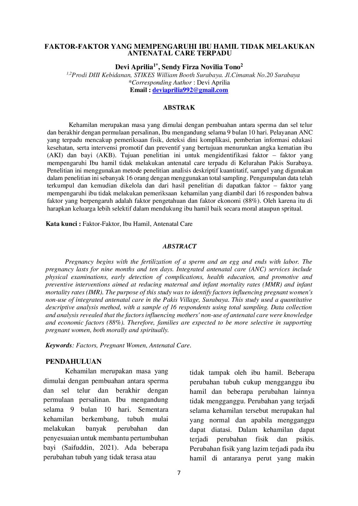Berdasarkan hasil penelitian, faktor-faktor yang mempengaruhi ibu hamil tidak melakukan antenatal care di Kelurahan Pakis Surabaya adalah faktor pengetahuan dan ekonomi sebanyak 14 responden dengan persentase 88%.Diharapkan hasil penelitian ini menjadi dasar dalam mengembangkan upaya peningkatan pemeriksaan khususnya para ibu hamil, dan mampu menjadi panduan untuk peneliti berikutnya tentang faktor-faktor yang bias memicu para ibu hamil untuk melakukan antenatal care.